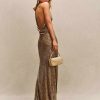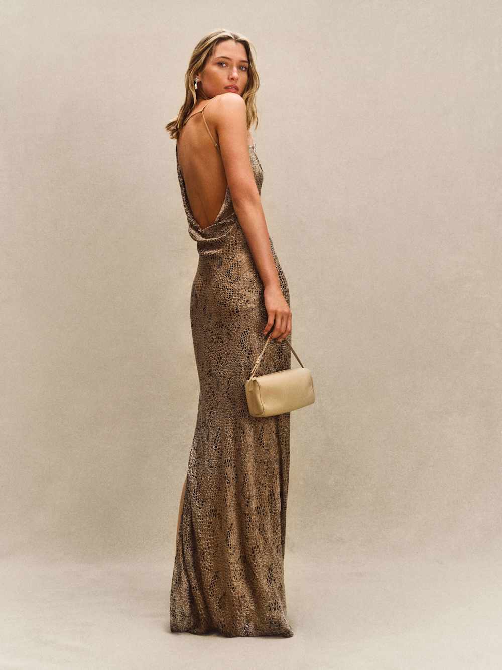 Romance for one. Shop the Pheby Dress from Reformation, a sleeveless floor-length dress with an asymmetrical cowl neckline and high side slit.