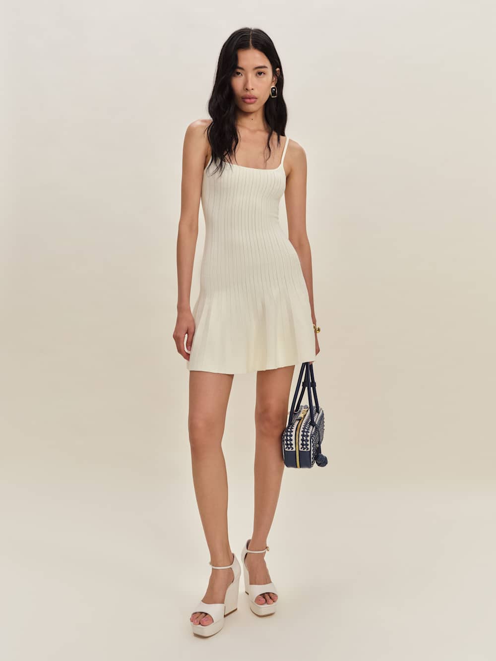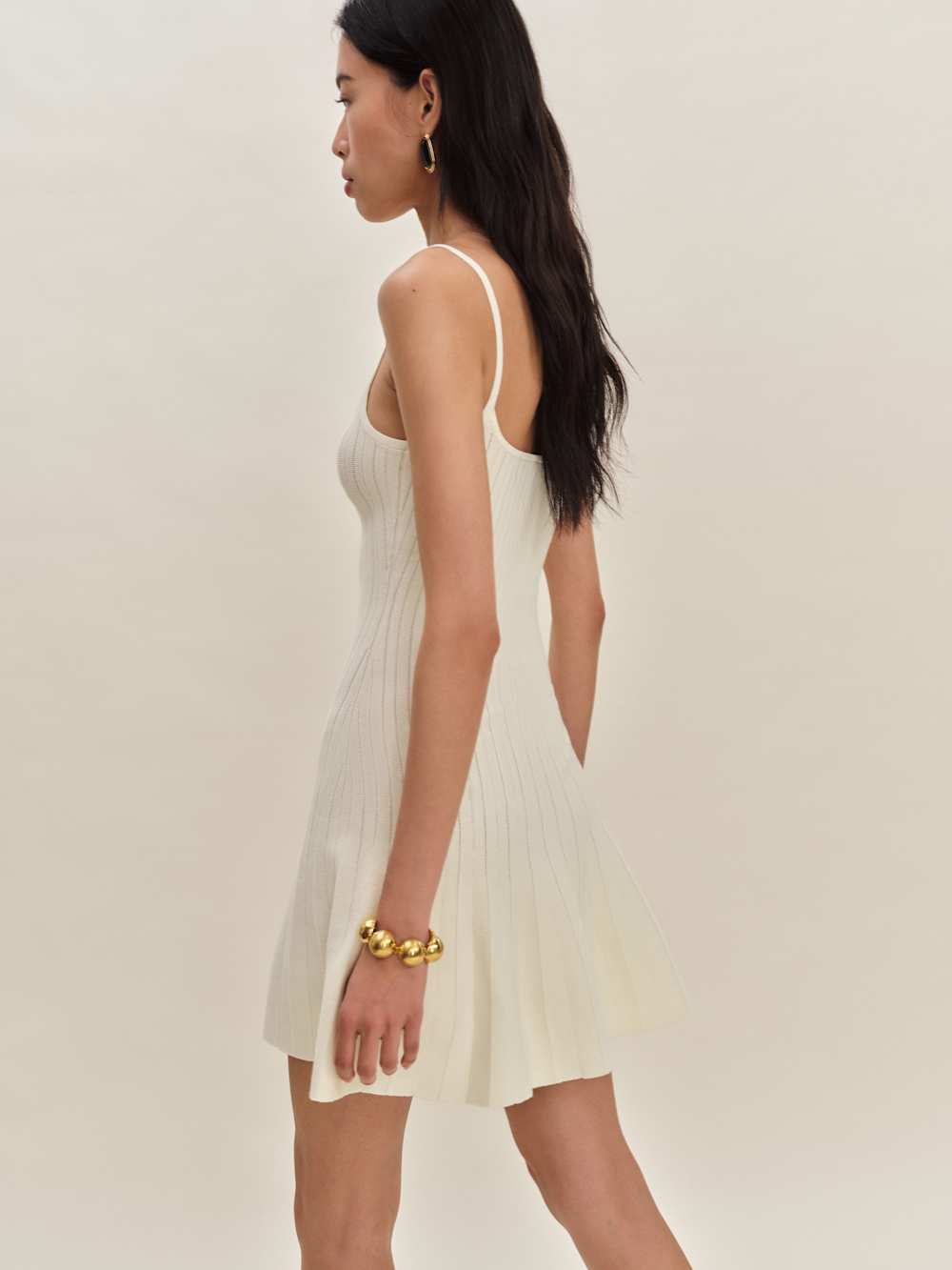 You make it look easy. Shop the Rhia Cotton Sweater Dress from Reformation, a sleeveless mini dress with a scoop neck and a pleated A-line skirt.