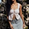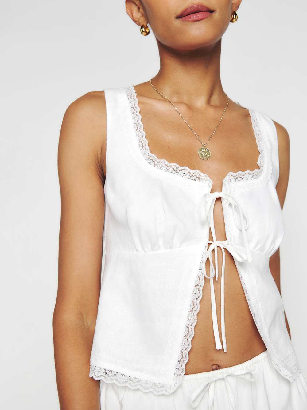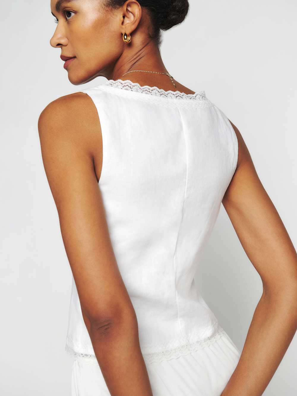 Romance for one. Shop the Rosalie Linen Top from Reformation, a sleeveless top with a square neckline and lace hems.