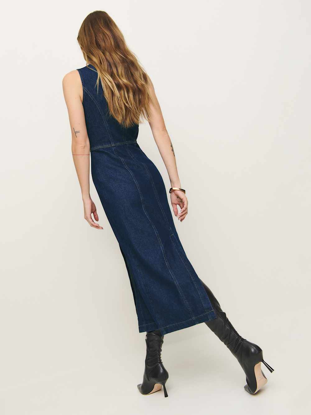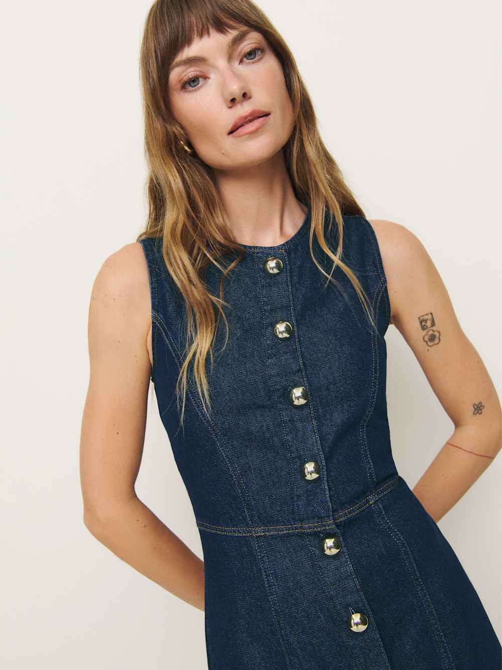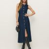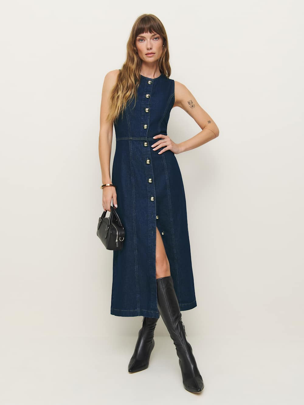Denim time. Shop the Roswell Denim Midi Dress from Reformation, a sleeveless denim midi dress with a button front.