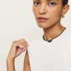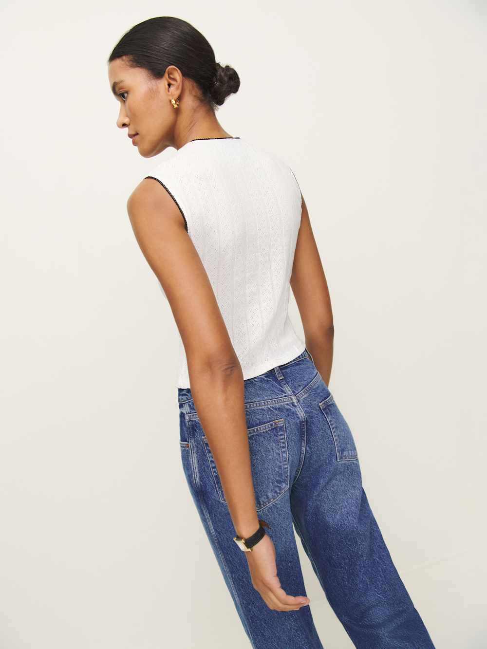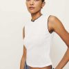 Up top. Shop the Ryland Pointelle Tank from Reformation, a sleeveless pointelle tank with a high neckline and lace trim.