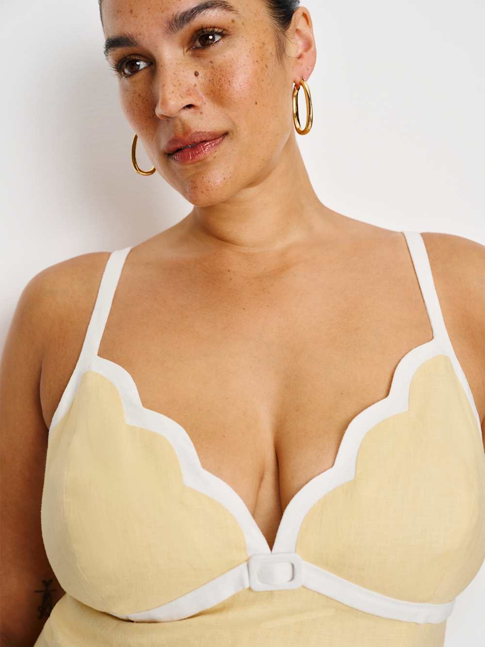 Sorry to all your other dresses. Shop the Sara Linen Dress ES from Reformation, a sleeveless midi dress with scalloped trim and contrast stitching.