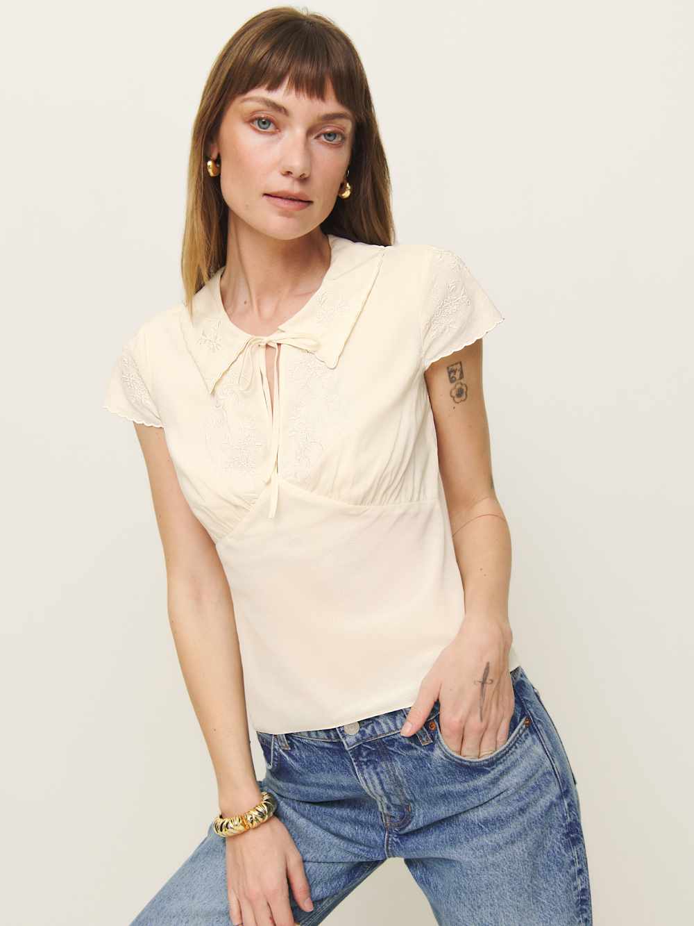 Up top. Shop the Simonette Top from Reformation, a top with cap sleeves, a collared neckline, and embroidered detailing.