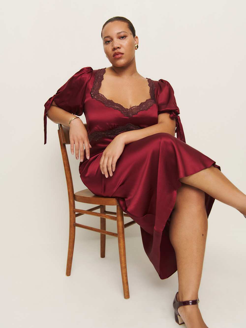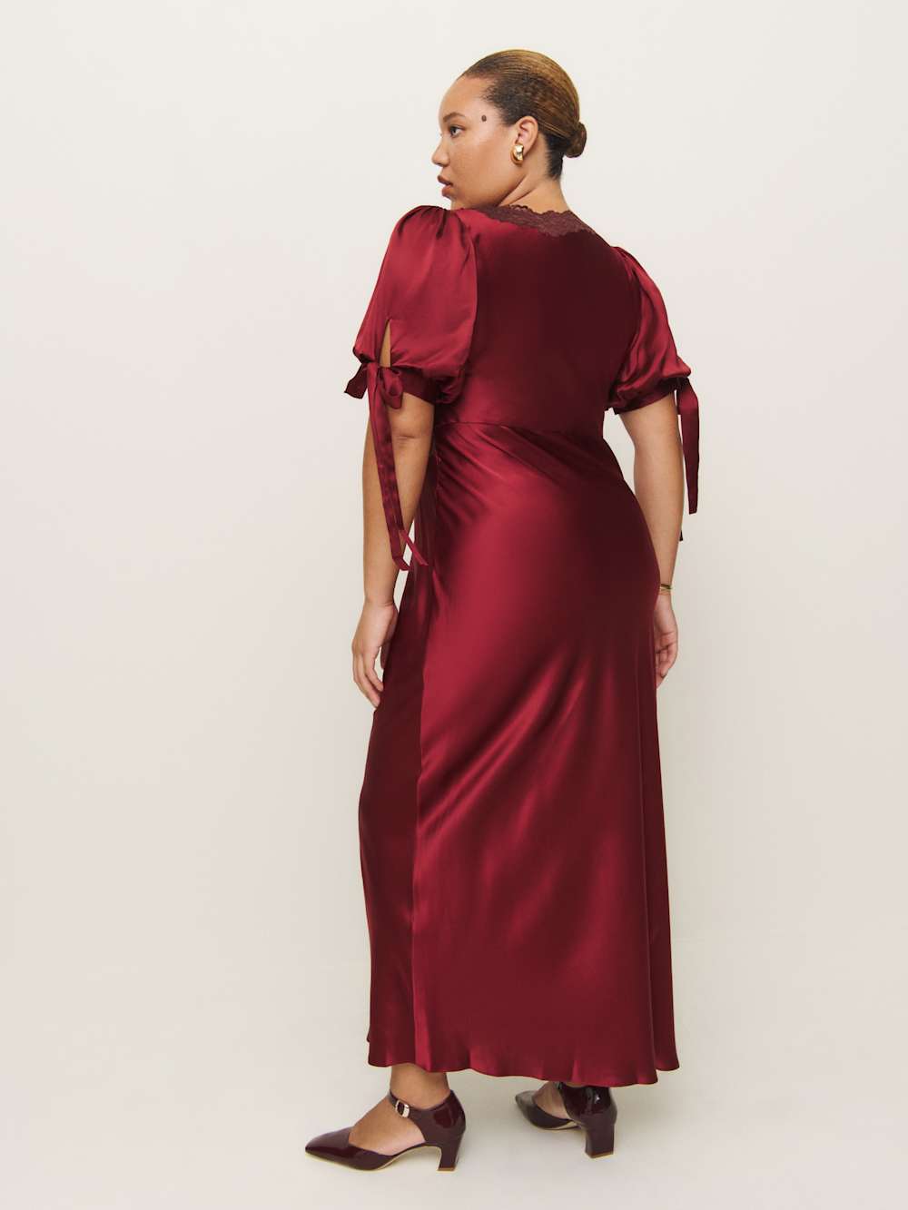 Wear the dress. Shop the Stella Silk Dress ES from Reformation, a short puff sleeve maxi dress with lace detail.