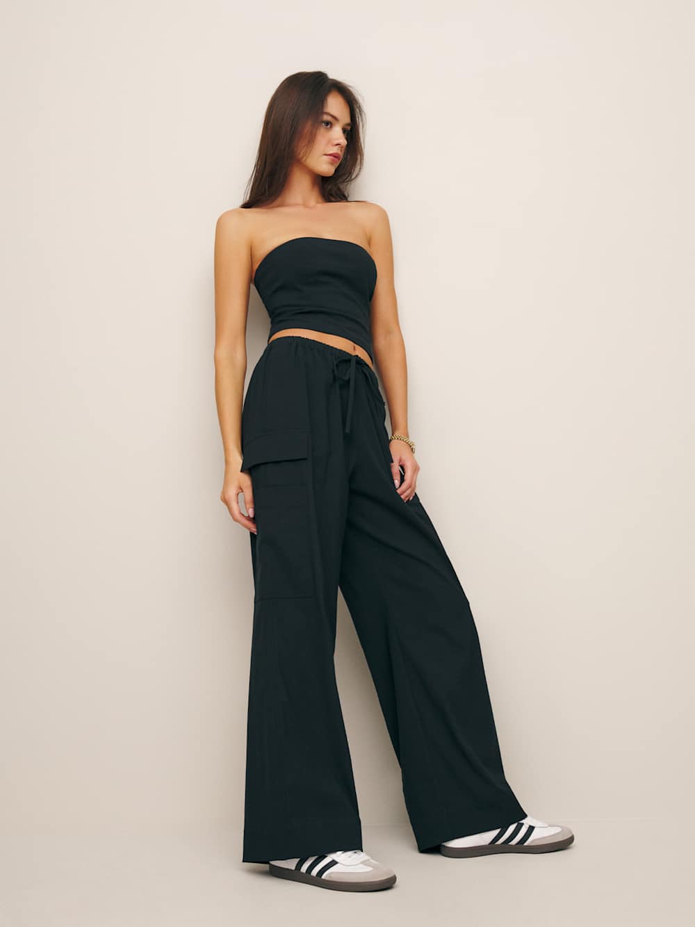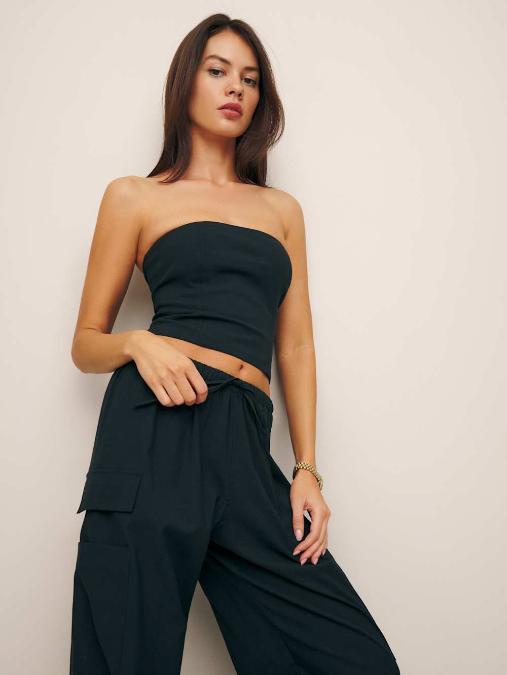 Get there late. Shop the Stella Two Piece from Reformation, a two piece with a strapless slim fitting top and relaxed fitting pants.