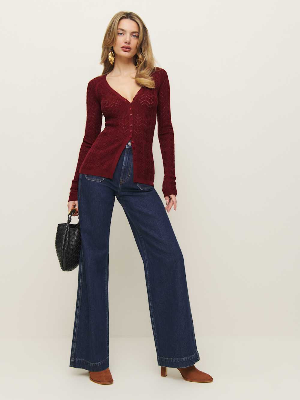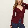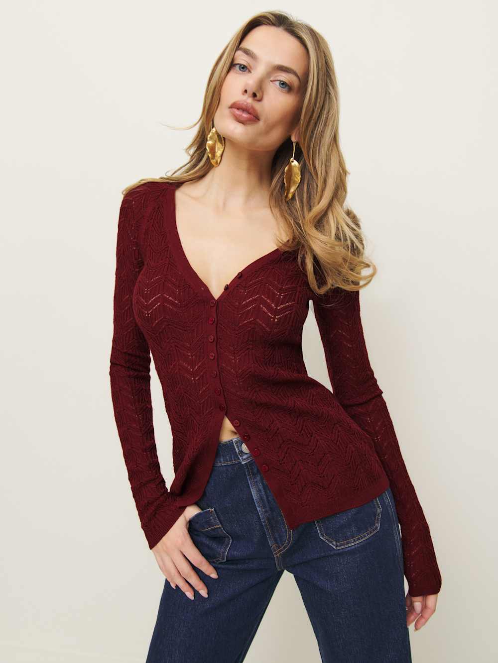 Easy little knit. Shop the Sutton Regenerative Merino Open Knit Sweater from Reformation, a long sleeve open-knit sweater with a v-neckline and button front.