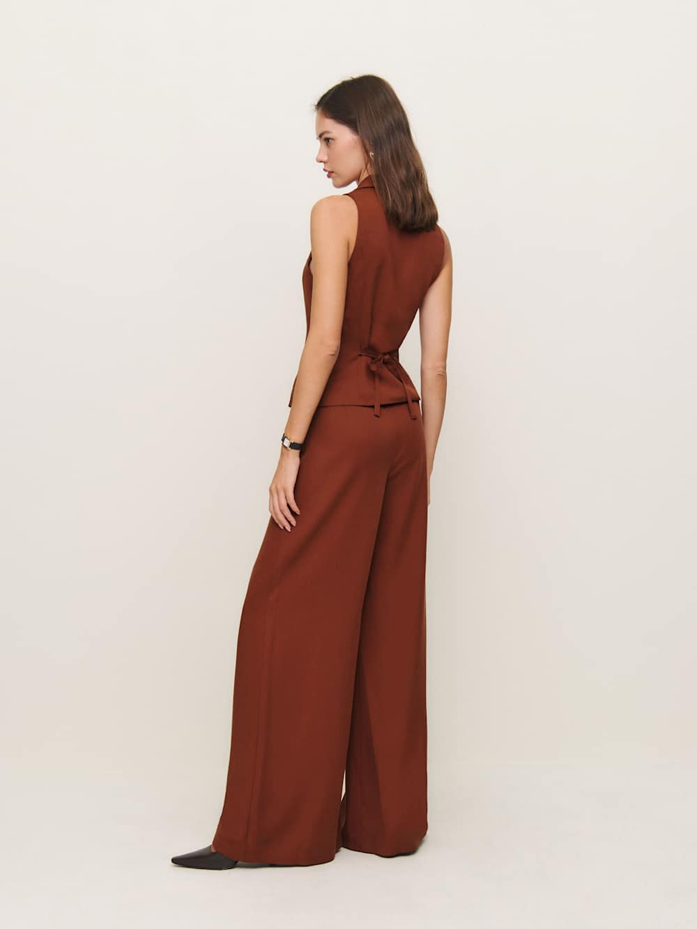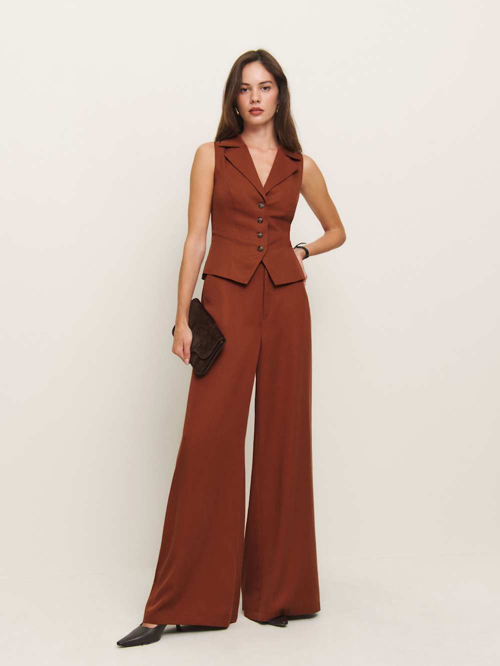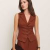 Package deal Shop the Taryn Two Piece from Reformation, a two piece set with a sleeveless vest top with center front buttons and a wide leg pant.