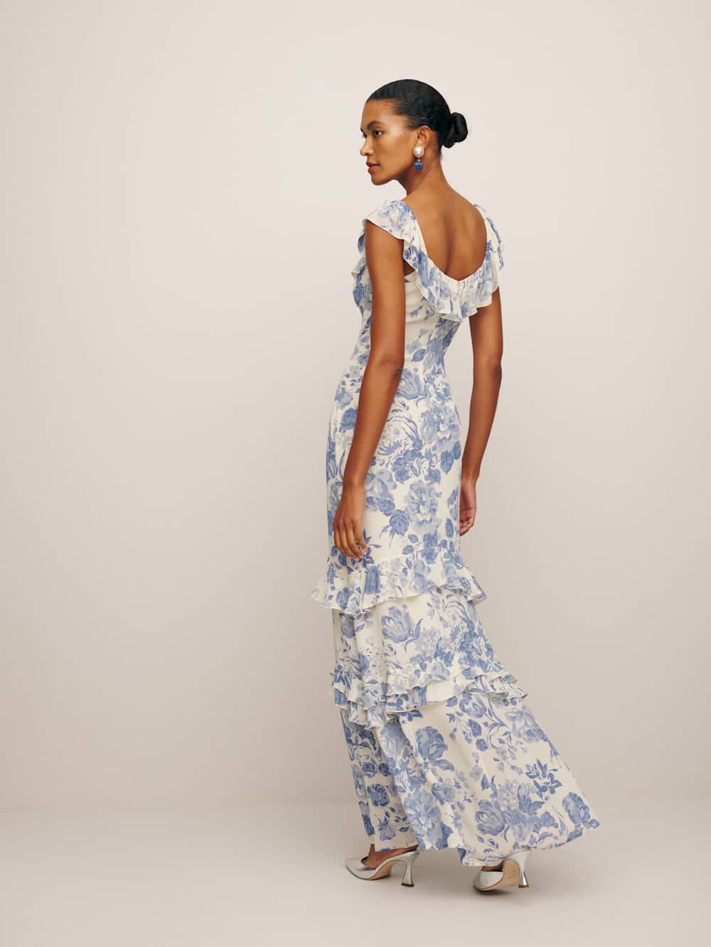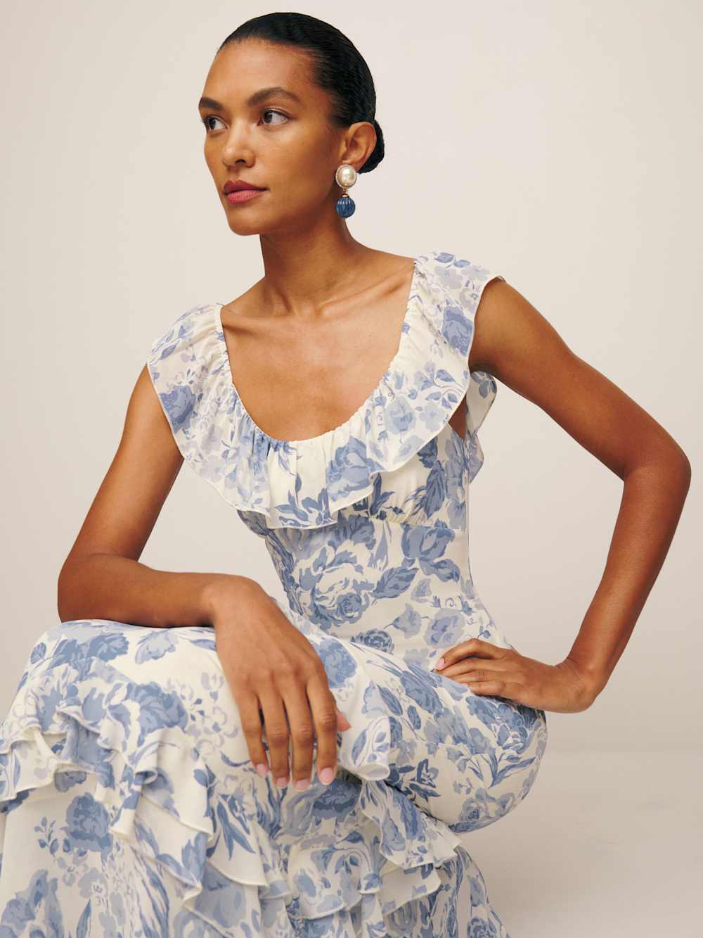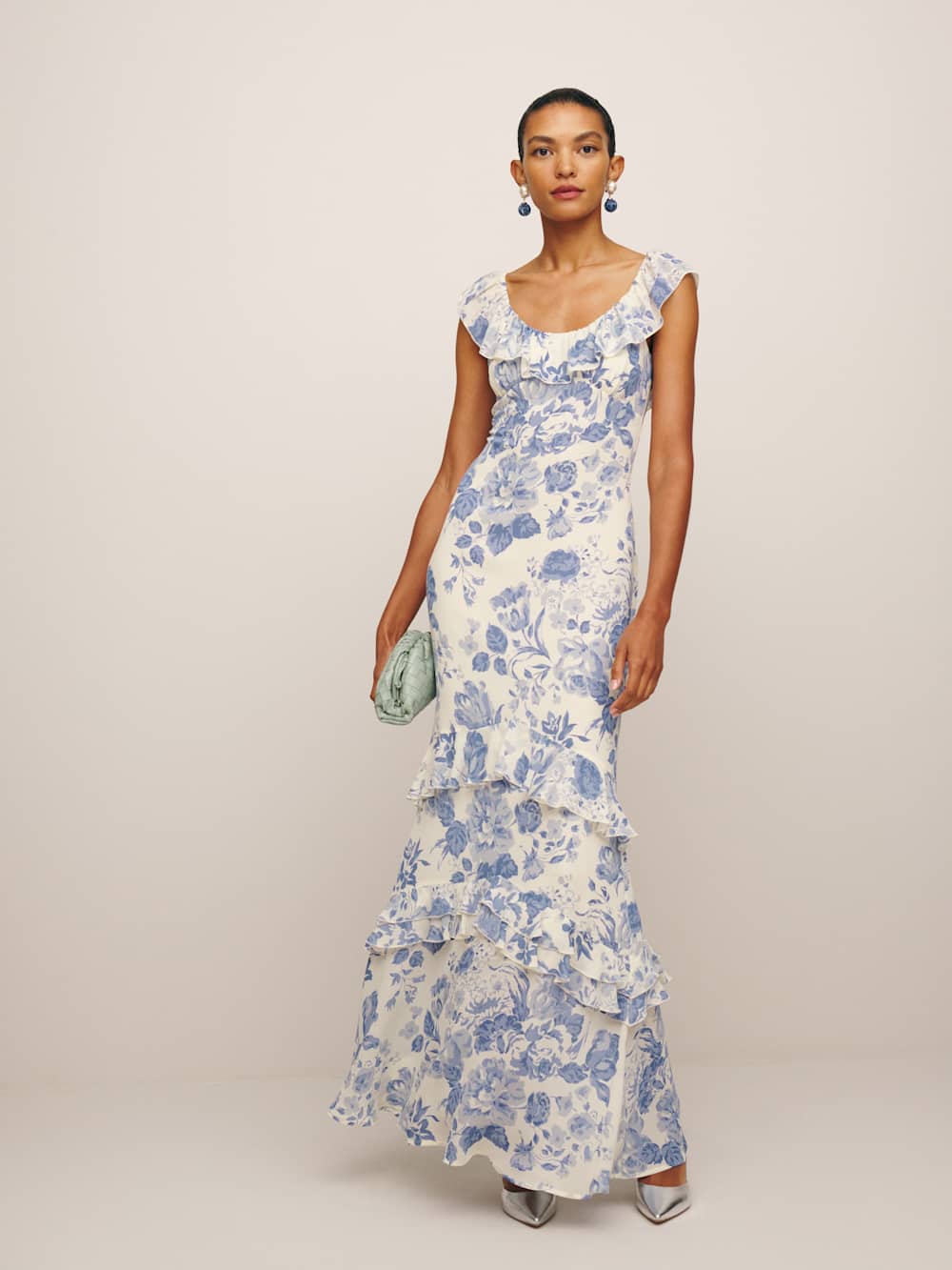 Romance alert. Shop the Tripoli Dress from Reformation, a maxi dress with a scoop neckline, ruffle detailing, and tiered ruffles throughout.