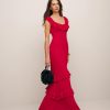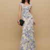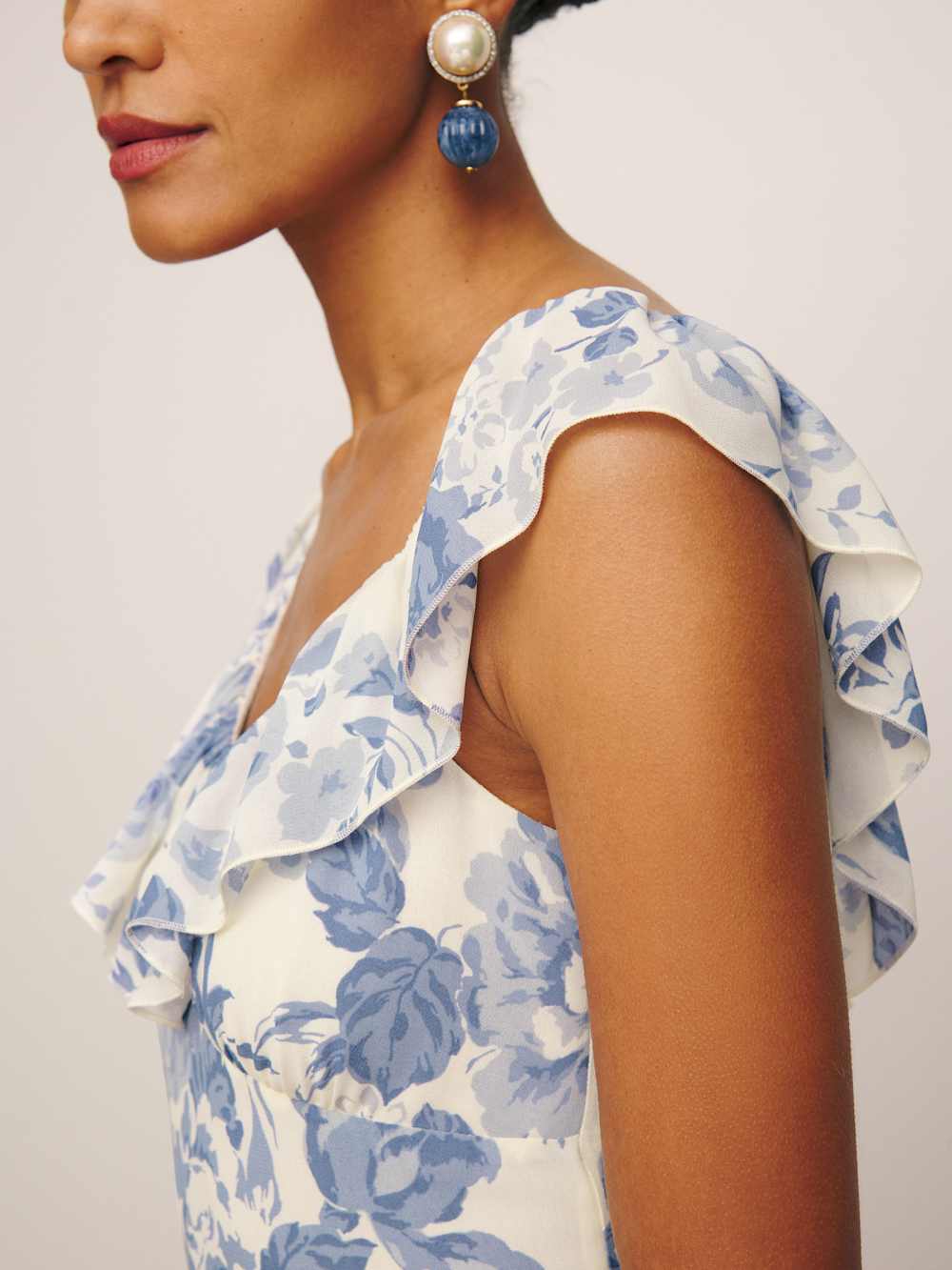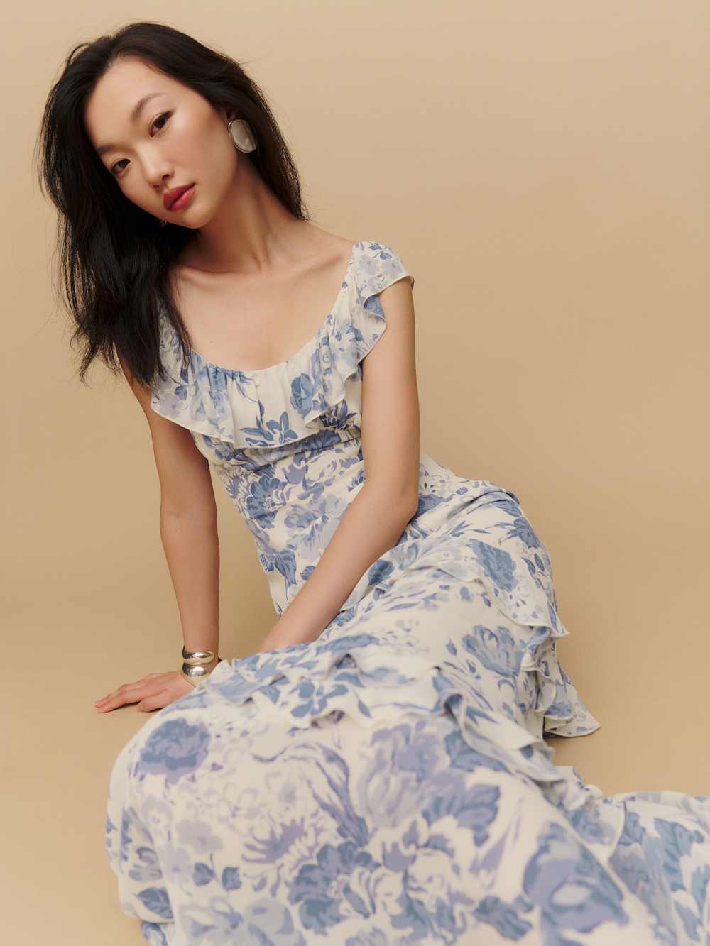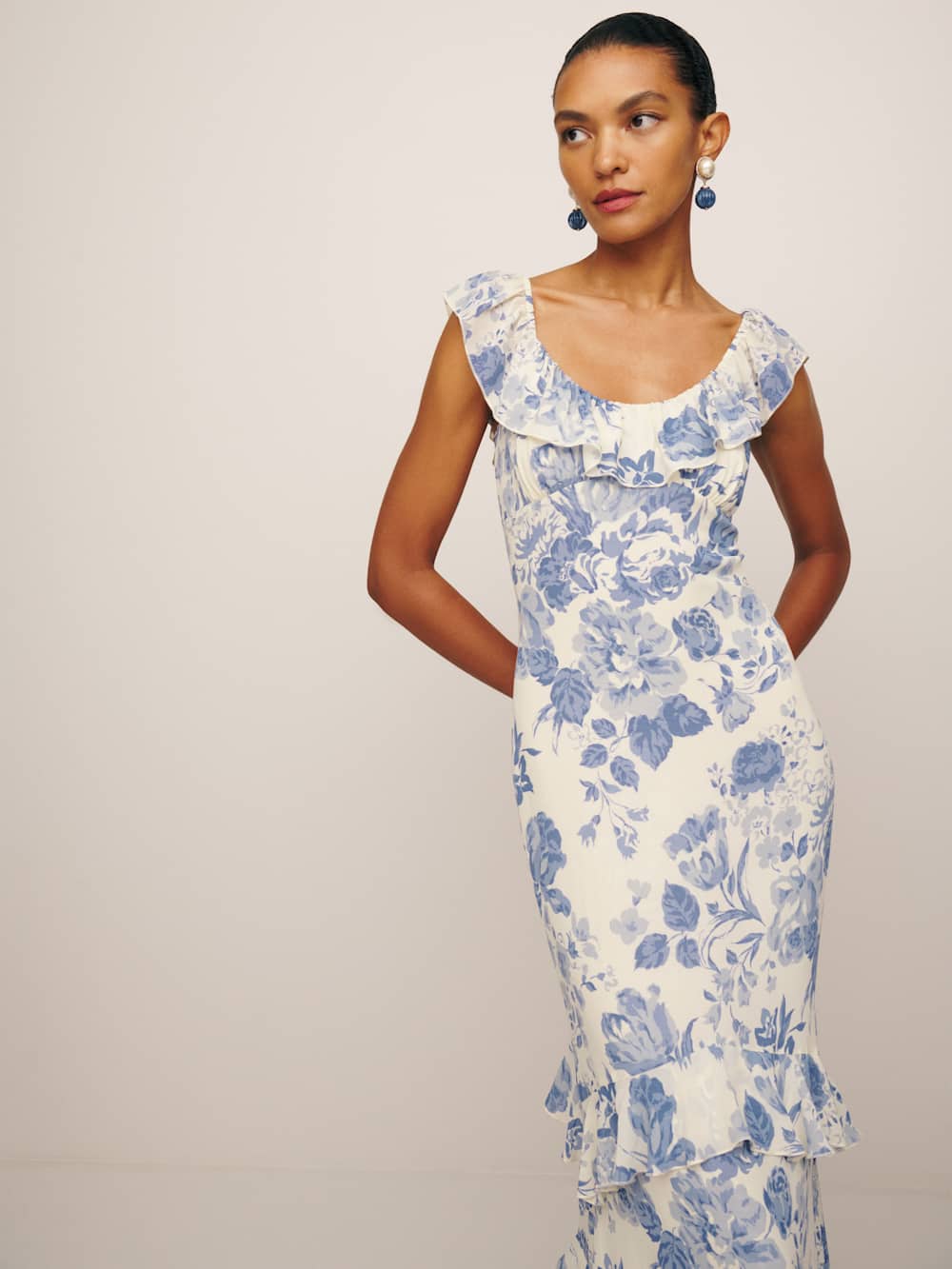 Romance alert. Shop the Tripoli Dress from Reformation, a maxi dress with a scoop neckline, ruffle detailing, and tiered ruffles throughout.
