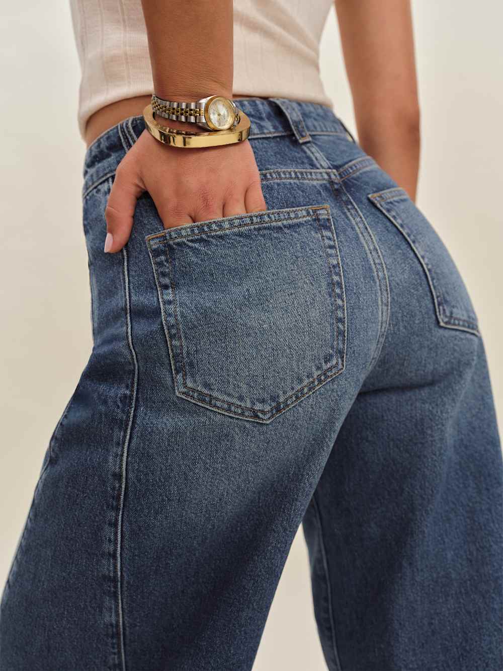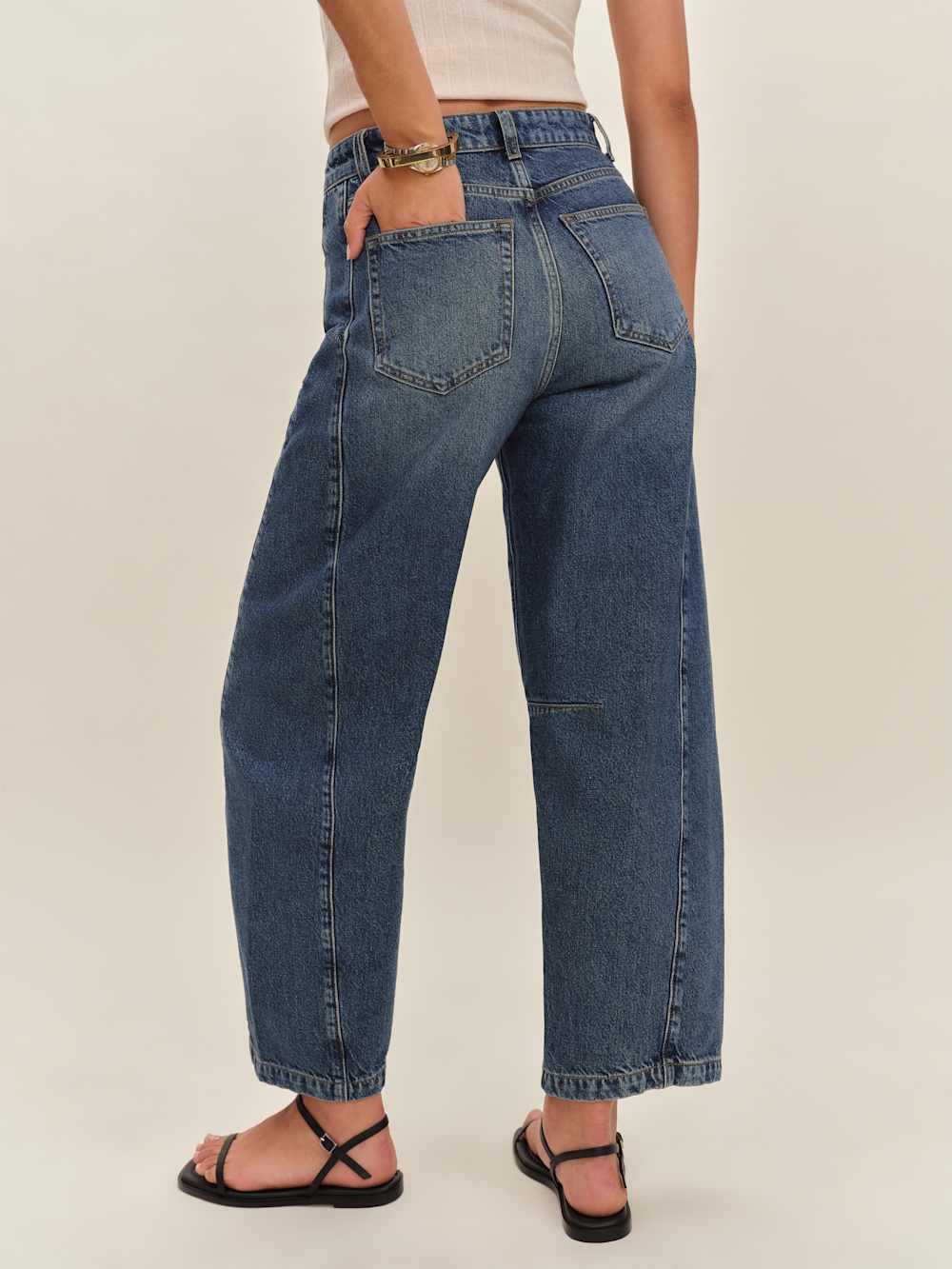 Who, me. Shop the Tyler Mid Rise Barrel Jeans from Reformation, a mid-rise jean with relaxed, cropped barrel leg.