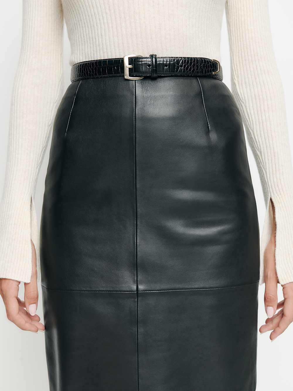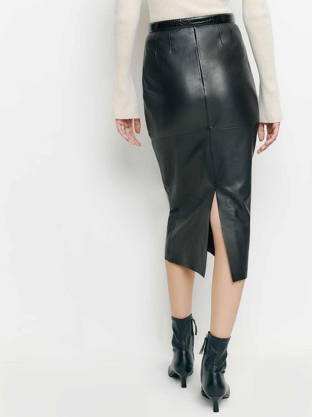 Let your legs out a little. Shop the Veda Bedford Leather Midi Skirt from Reformation, a midi skirt with a back slit, and pencil silhouette.