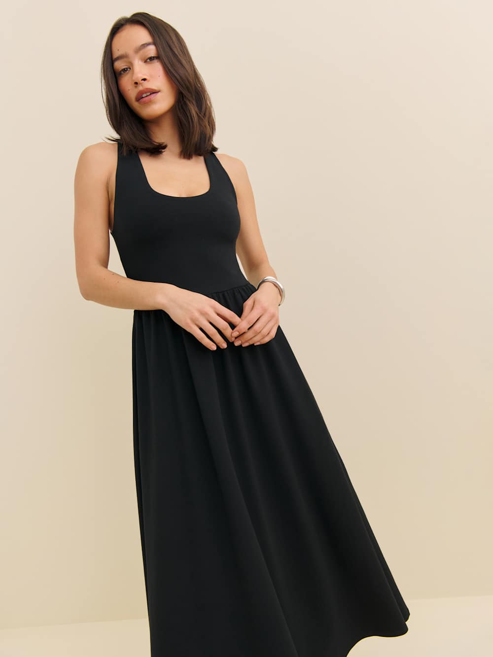 Wear the dress. Shop the Walker Knit Dress from Reformation, a sleeveless midi dress with a fitted bodice and full skirt.