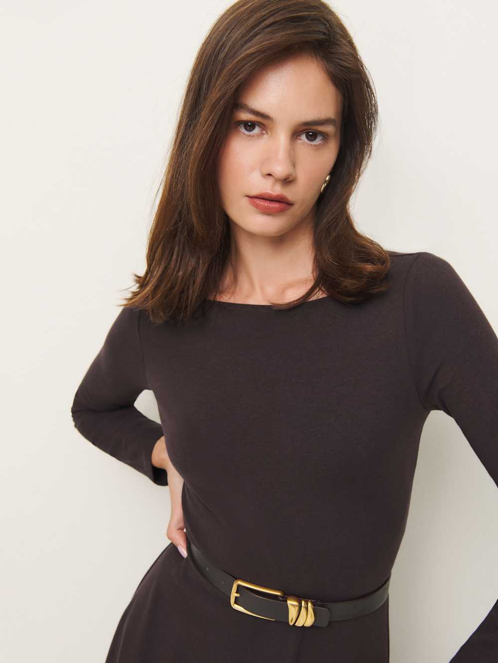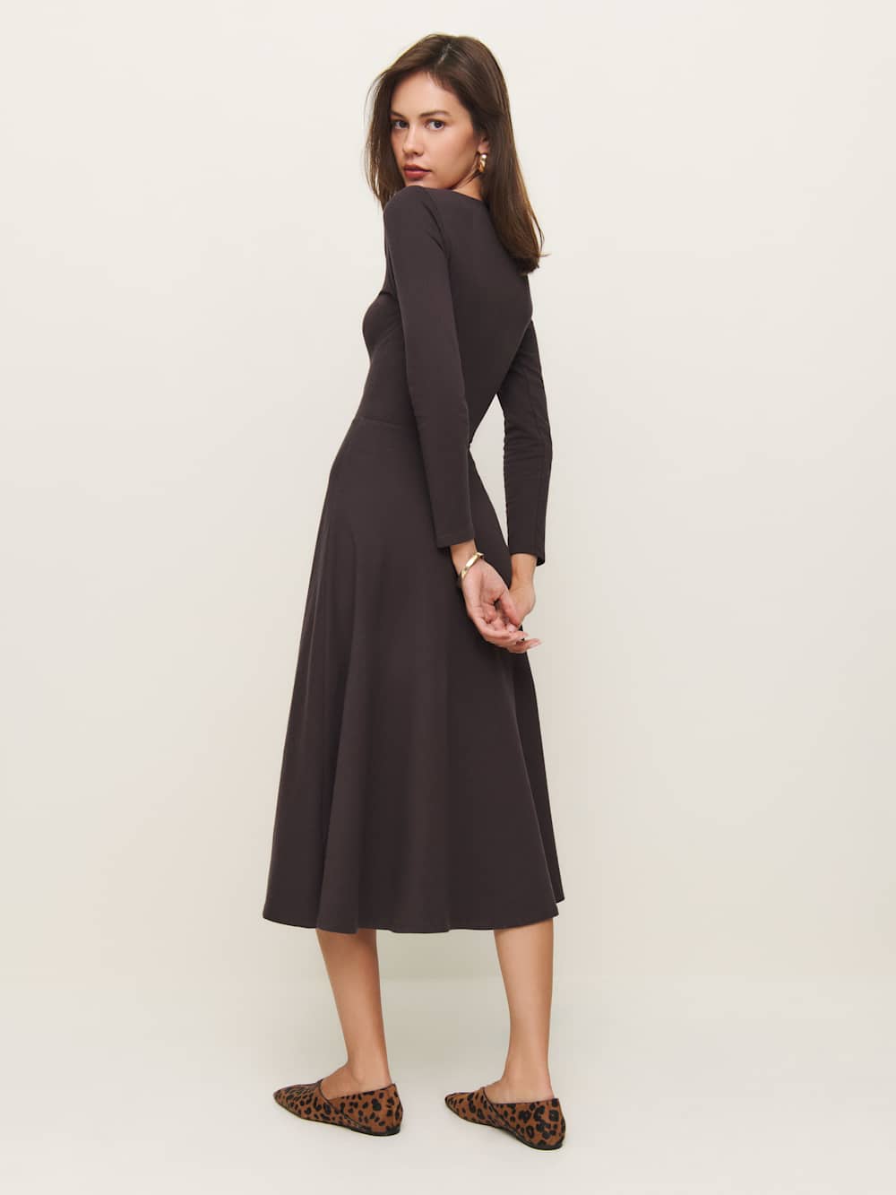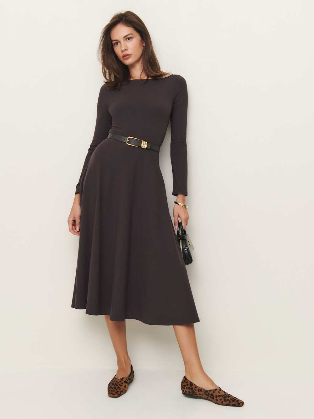 Wear the dress. Shop the Wiley Knit Dress from Reformation, a long-sleeve midi dress with a boat neckline and flared skirt.