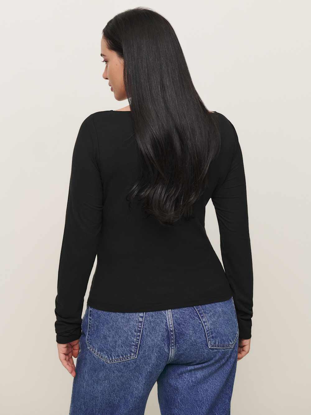 On top of it. Shop the Wiley Knit Top ES from Reformation, a long-sleeved top with a boat neck.