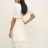 How dreamy. Shop the Woodson Dress from Reformation, a short sleeve, midi length, slim fitted, dress. It features a button front and lace detailing throughout.