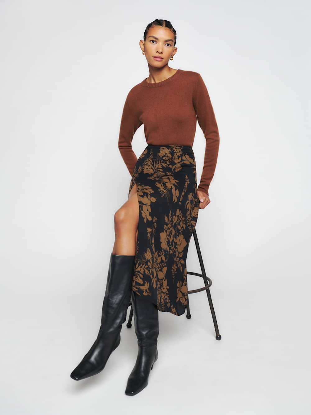Show a little leg. Shop the Zoe Skirt from Reformation, a classic midi skirt but with a dramatic slit.