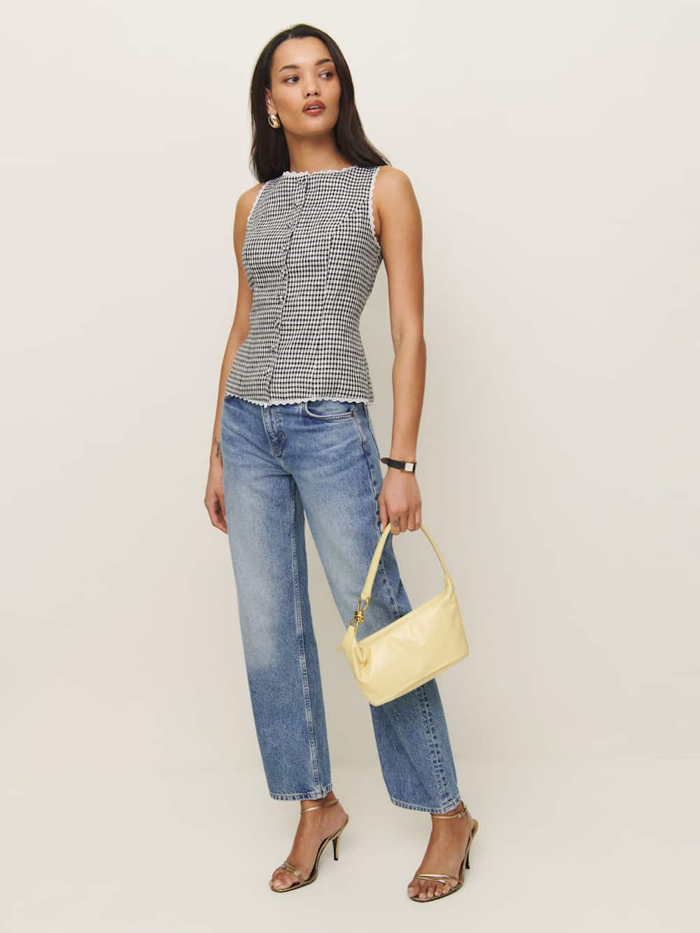 What do we have here? Shop the Amela Linen Top from Reformation, a sleeveless vest top with a button front and lace detailing at the neckline.