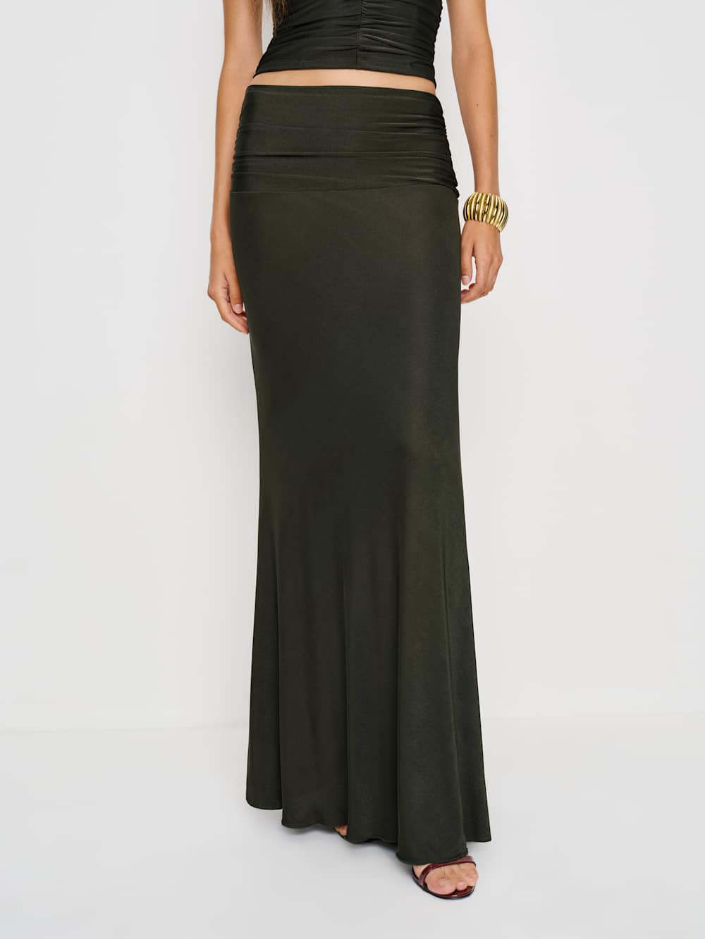 Have we met. Shop the Amir Knit Two Piece from Reformation, a strapless top with a plunging neckline and ruching details throughout with a matching maxi skirt.