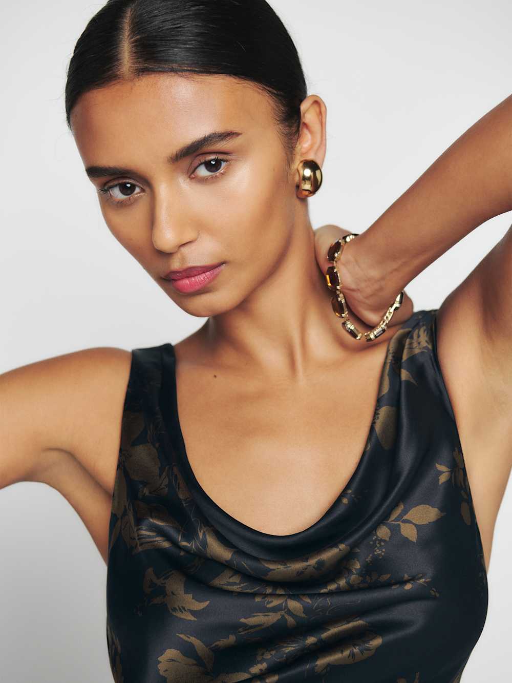 How dreamy. Shop the Annabelle Silk Dress from Reformation, a slim fitting, ankle length dress with a slight cowl neckline.