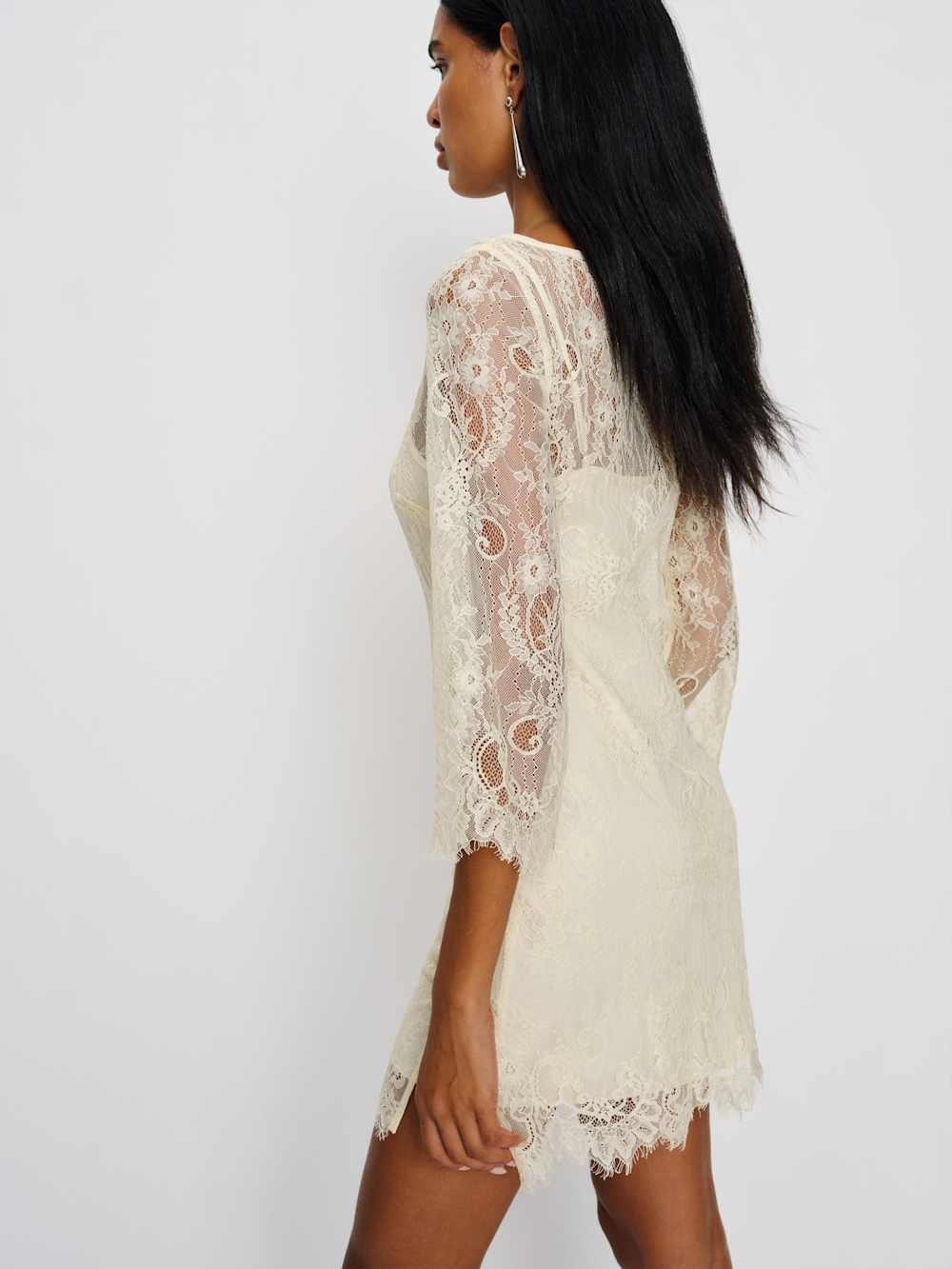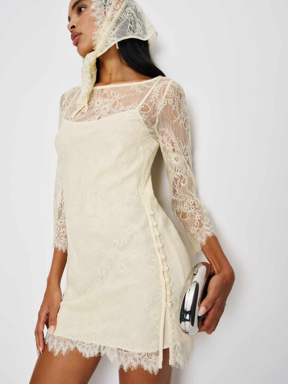 Detail oriented. Shop the Annemarie Two Piece from Reformation, a long-sleeved mini dress with buttons up the side and a matching scarf.