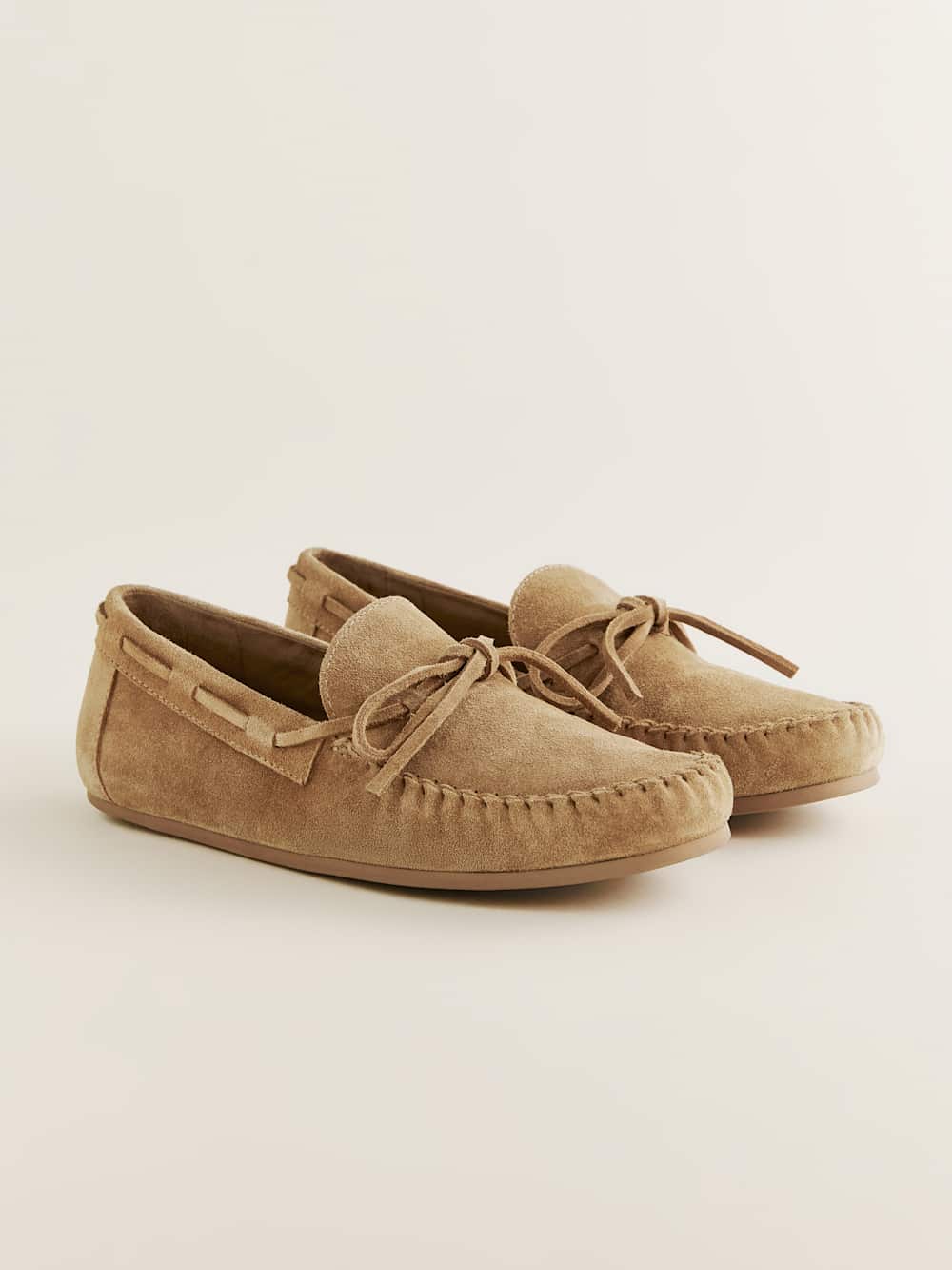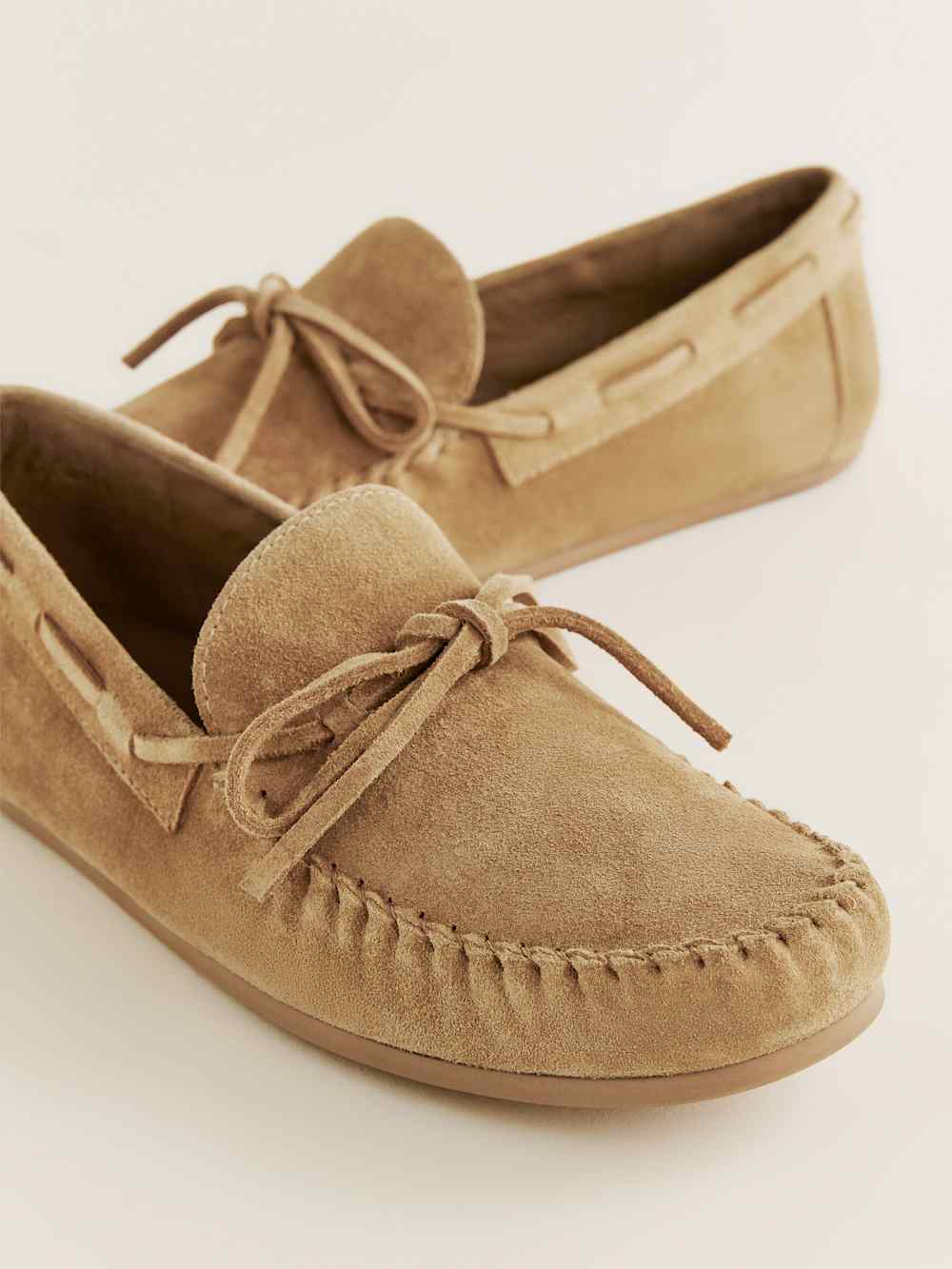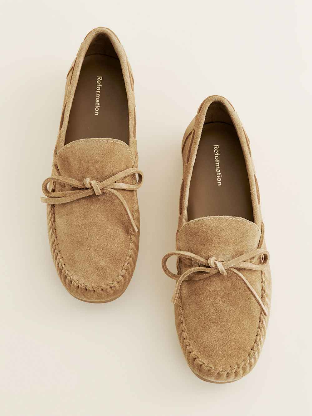 Wear me. Shop the Annette Moccasin from Reformation, a flat, boat-style loafer with an adjustable tie at the upper.