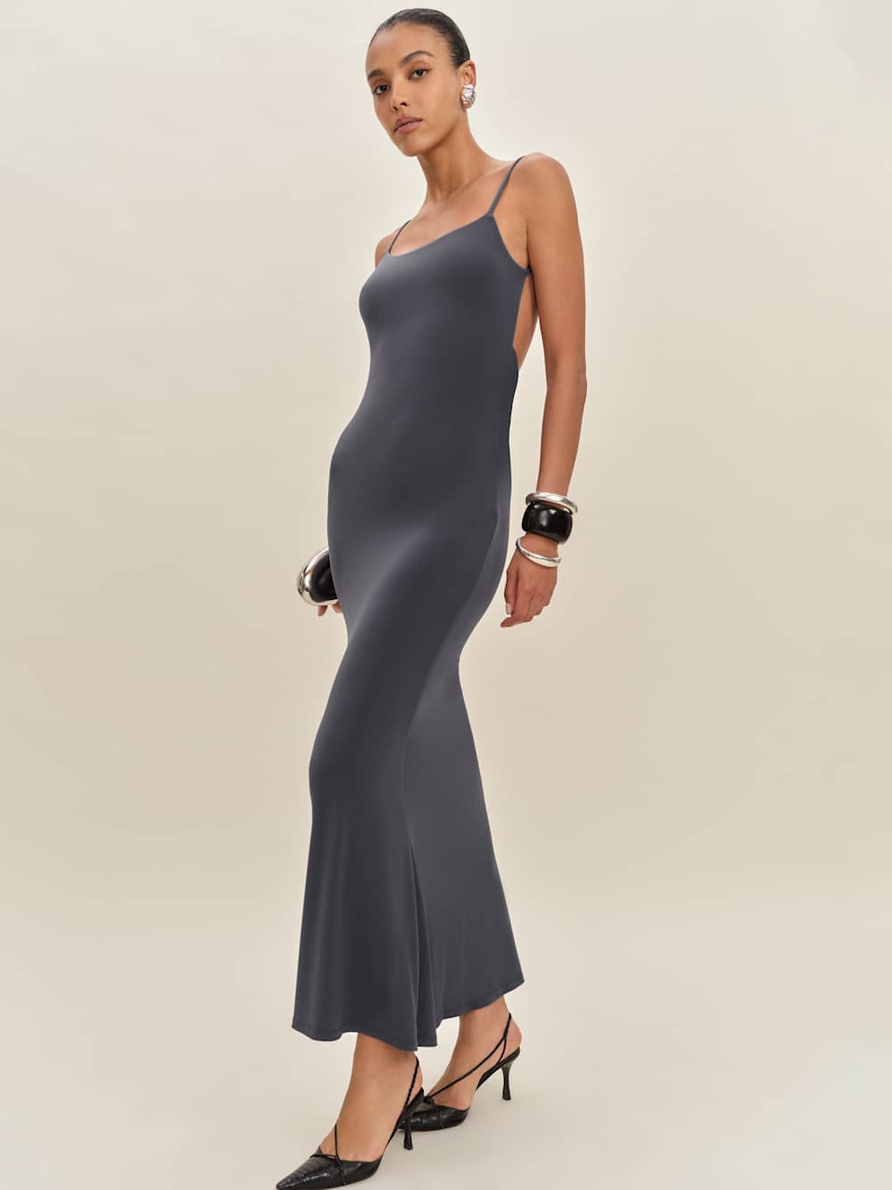 Don’t flirt with me. Shop the Averil Knit Dress from Reformation, a sleeveless maxi dress with a straight neckline and an open back.