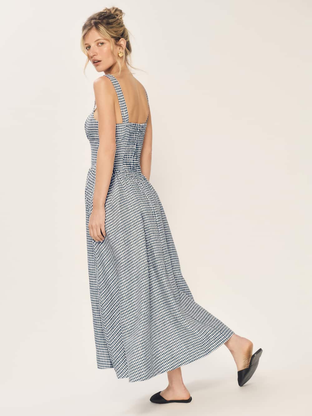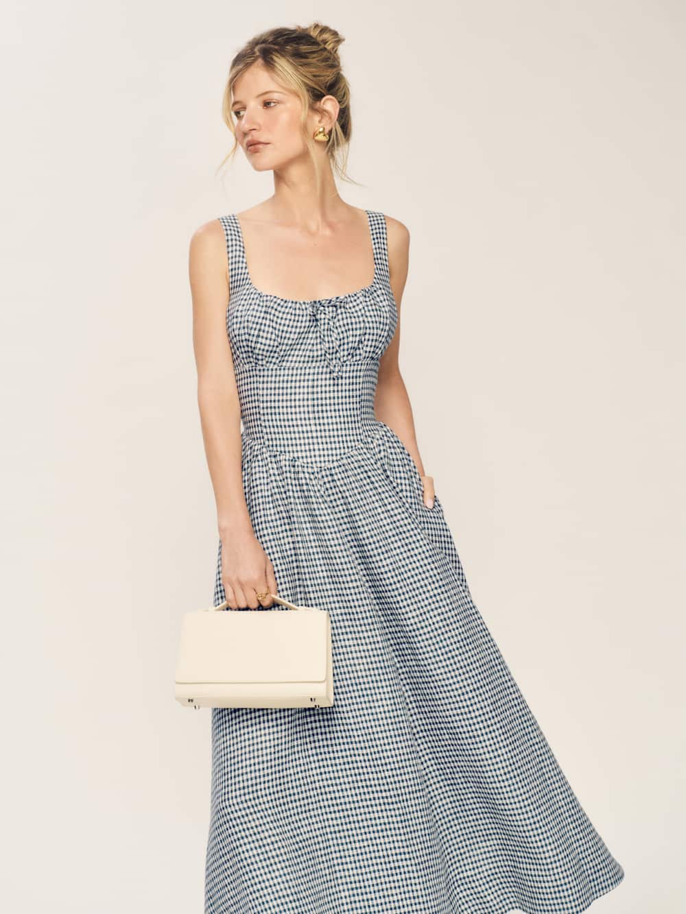 Easy breezy. Shop the Balia Linen Dress from Reformation, a sleeveless maxi dress with a drop waist, scoop neckline, and front tie.