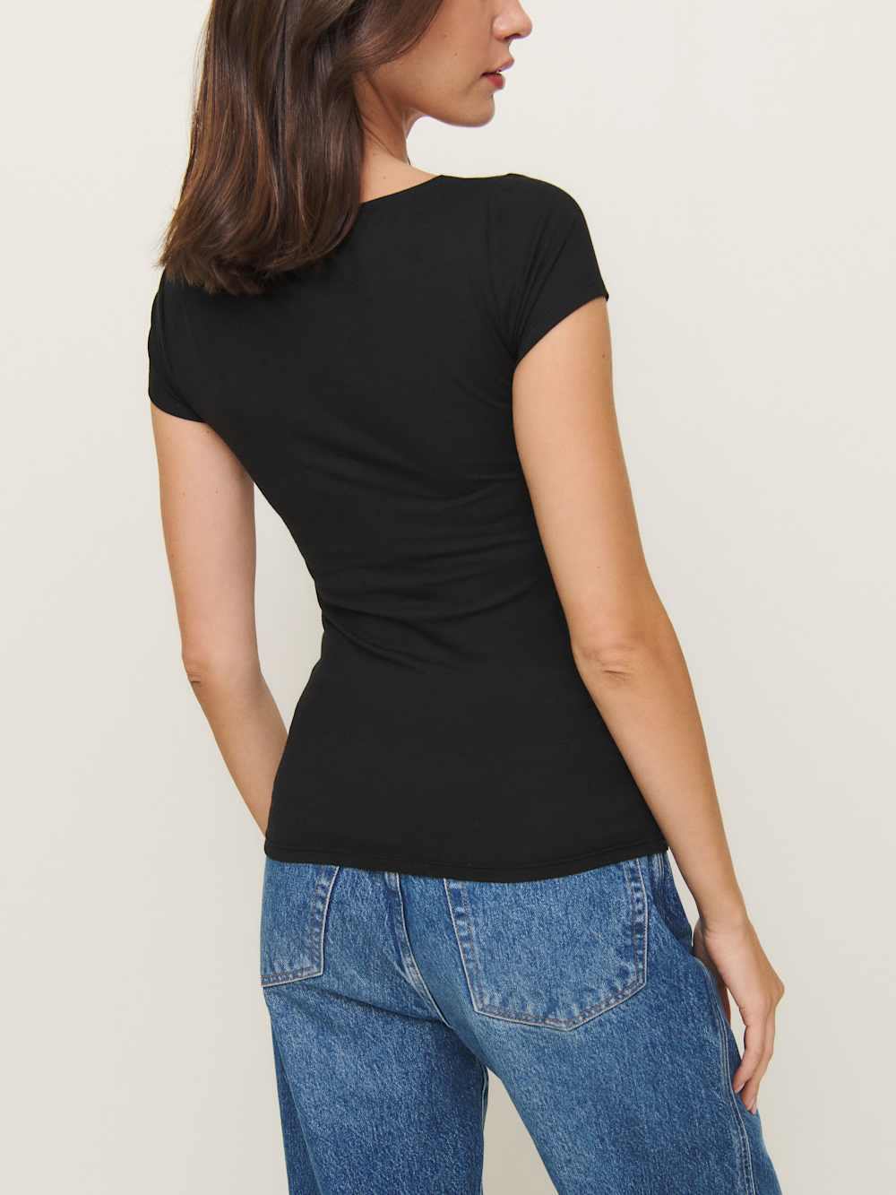 Soft and stretchy if you’re into that. Shop the Bardot Knit Top from Reformation, a short sleeve top with a square neckline.