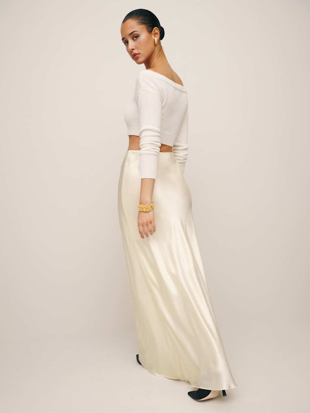 Let your skirt do the talking. Shop the Bella Satin Skirt from Reformation, a bias cut maxi skirt with an elasticated waist.
