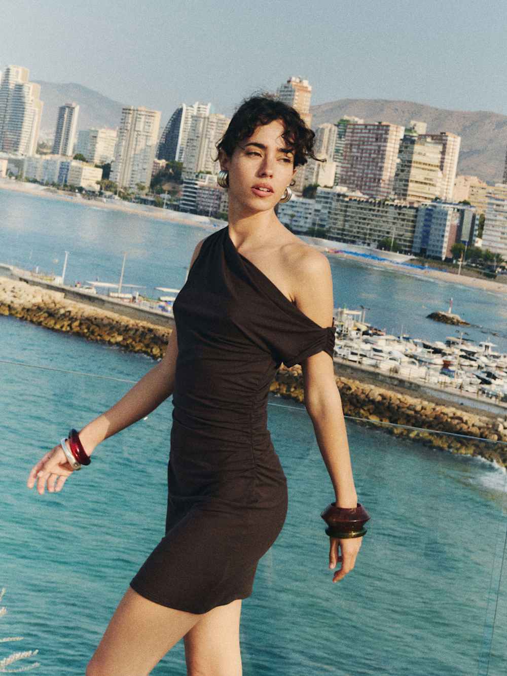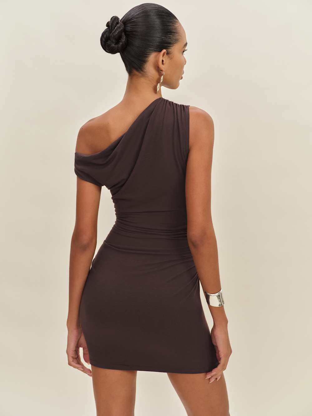 Don’t forget to stretch. Shop the Belle Knit Dress from Reformation, a sleeveless mini dress with an asymmetrical neckline and ruched detailing.
