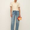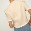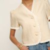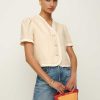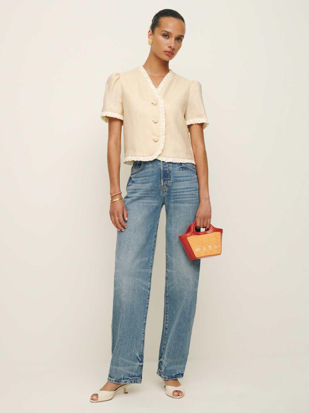 It’s called liking nature. Shop the Bess Linen Top from Reformation, a puff short sleeve, button down top with a ruffled hem.