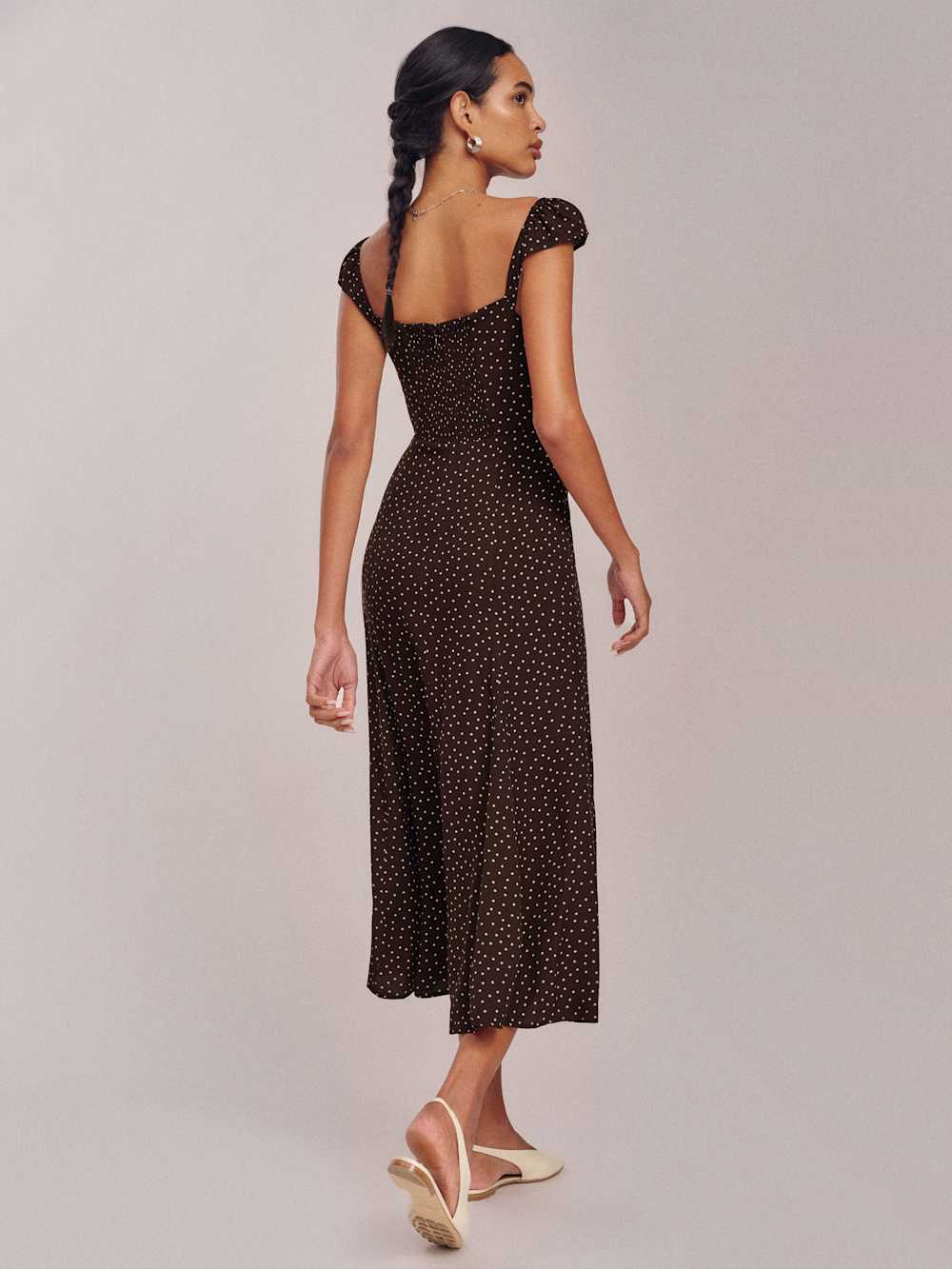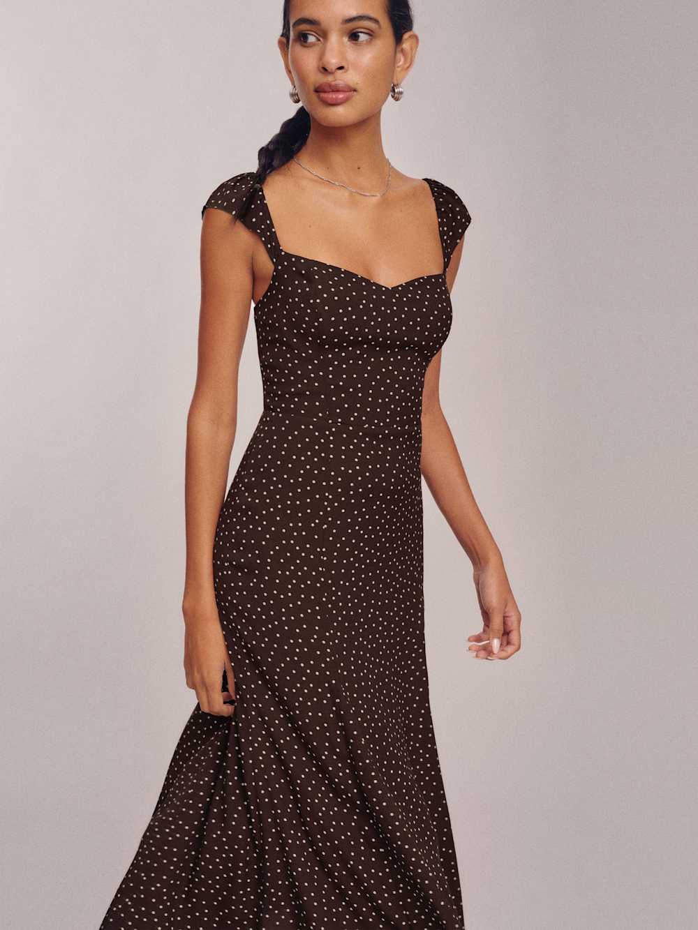 Wear the dress. Shop the Bryson Dress from Reformation, a midi dress with short, cap sleeves, a sweetheart neckline and an A-line silhouette.