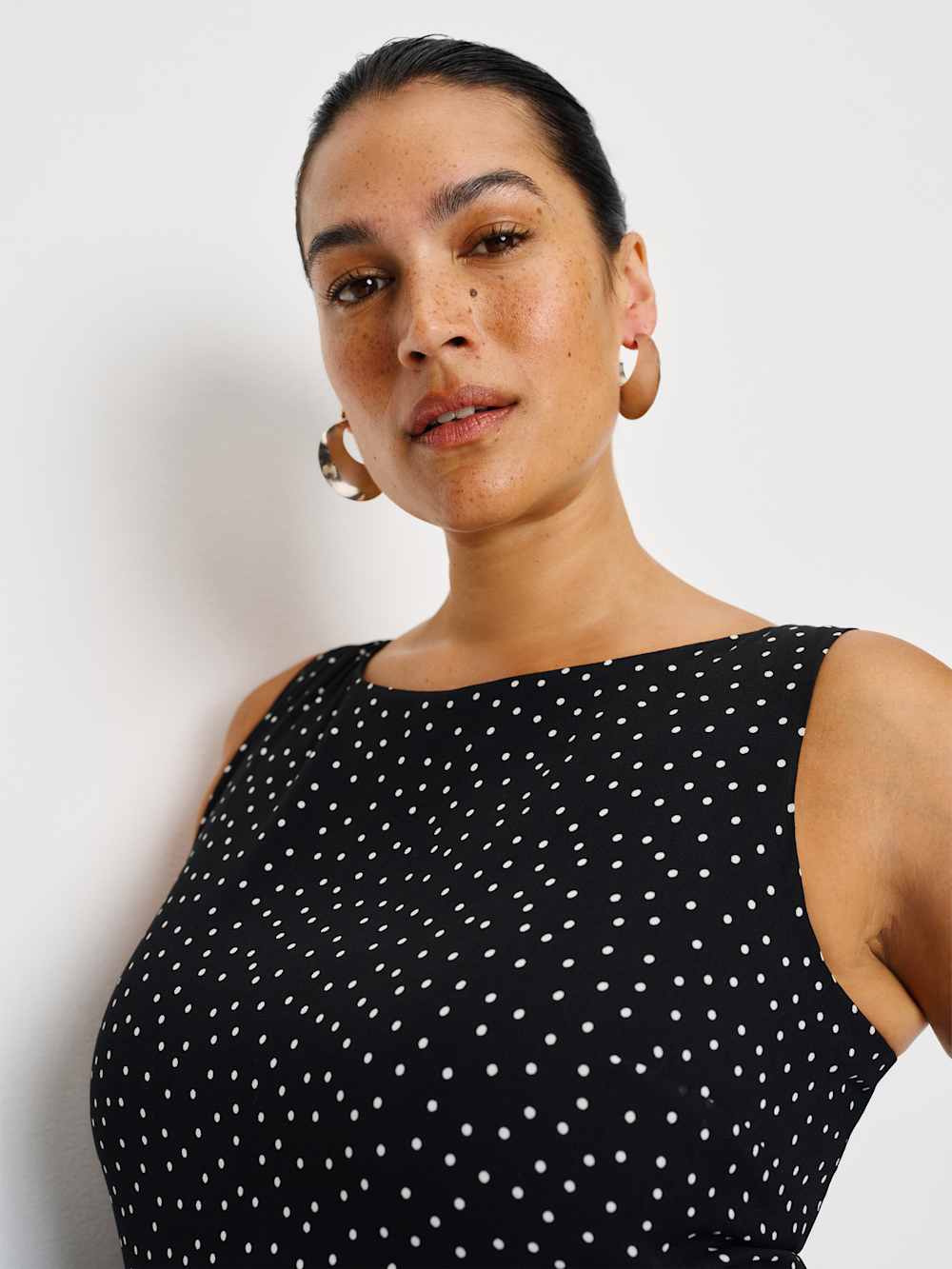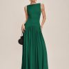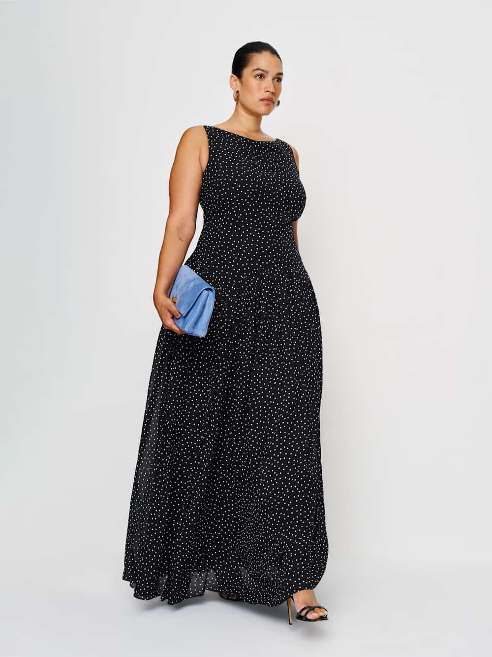 Wear the dress. Shop the Camella Dress ES from Reformation, a sleeveless full-length dress with a high boat neckline, drop waist, and pleated skirt.