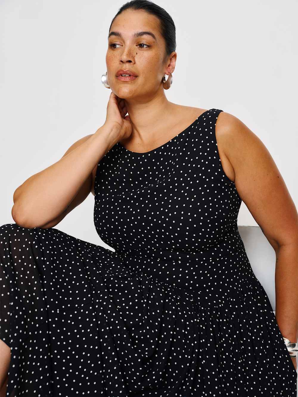 The model is wearing a size 14 and is 5’9.5", 29" waist, 43.5" hips, 39.5" bust.