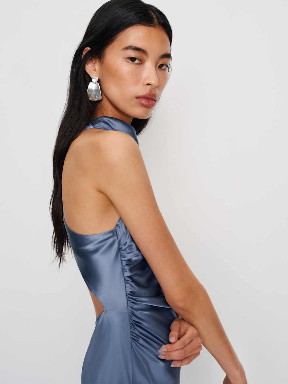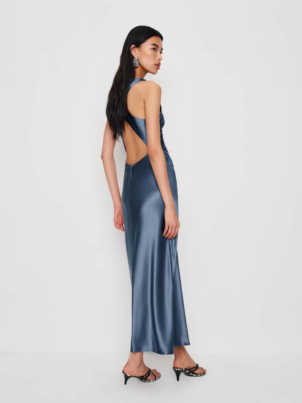 Sleeves are cancelled. Shop the Casette Silk Dress from Reformation, a sleeveless, midi dress with a cowl neck, side ruching and an open back.
