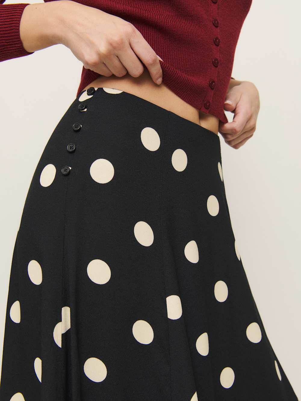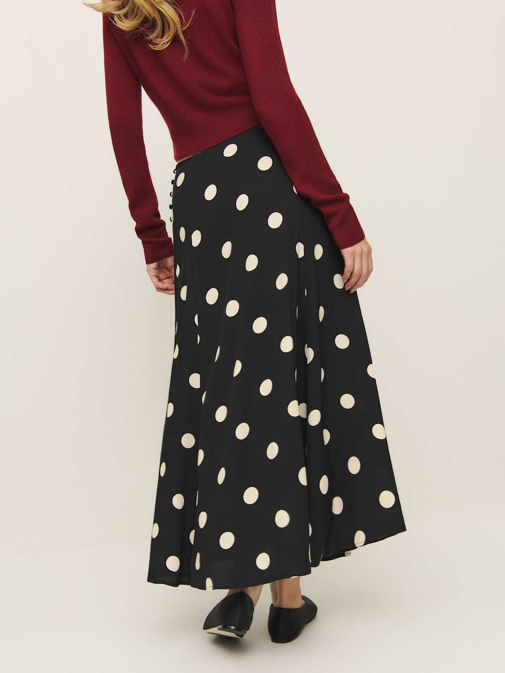 Wear the skirt. Shop the Claire Skirt from Reformation, a mid-rise maxi skirt with a full and flowy skirt.
