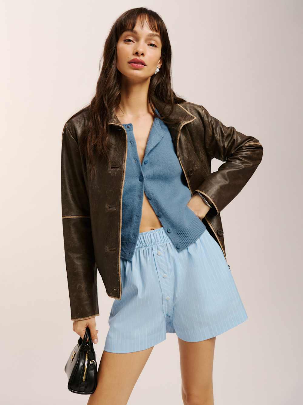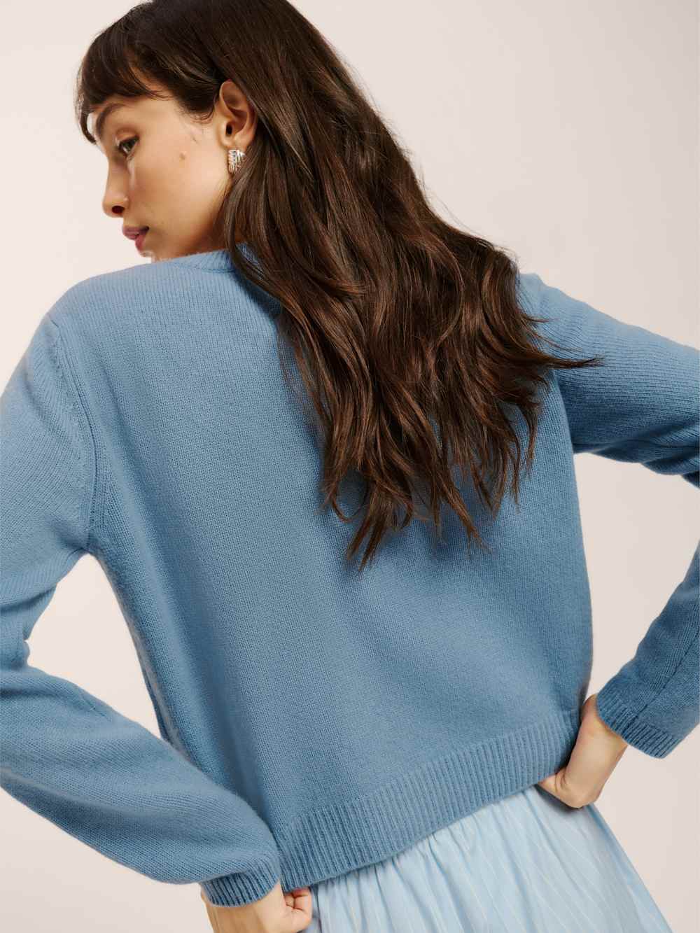 You’re a softie. Shop the Clara Cashmere Crew Cardigan from Reformation, a long sleeve, crewneck cardigan. It has a relaxed fit and functional button front.