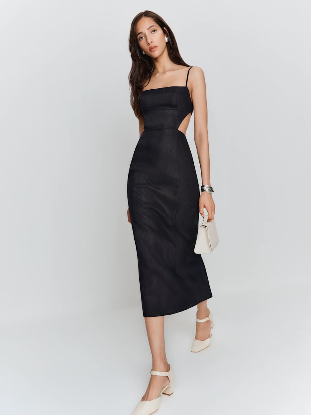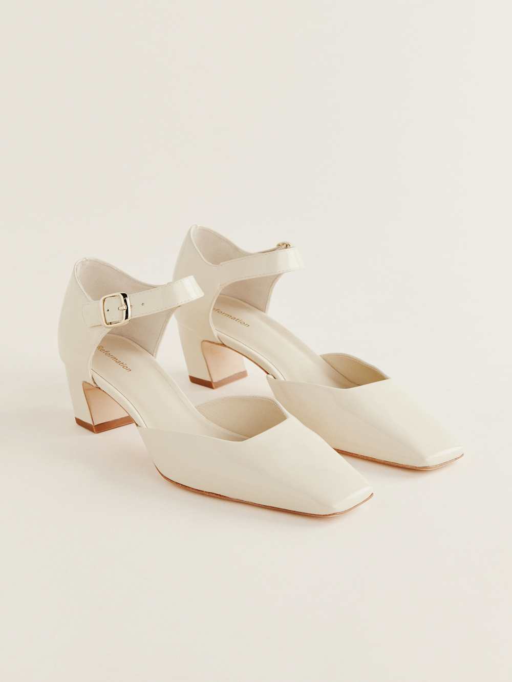 Wear me. Shop the Denise Pump from Reformation, a heeled pump with a pointed square toe and a caged back.