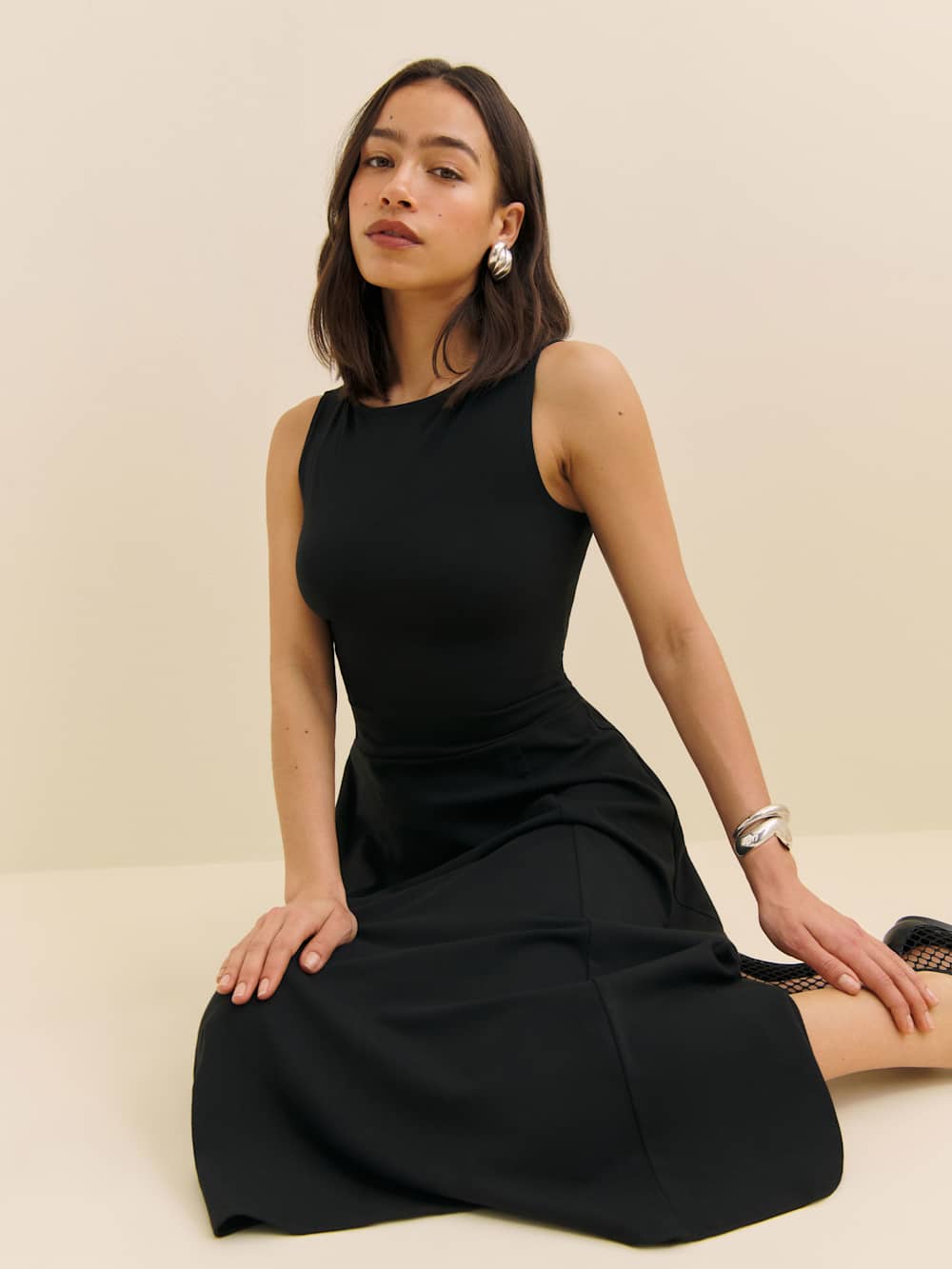 Wear the dress. Shop the Devin Knit Dress from Reformation, a sleeveless midi dress with a high neckline, drop waist, and pleating at the skirt.