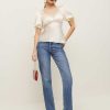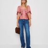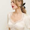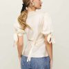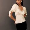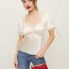 Up top. Shop the Dolly Silk Top from Reformation, a short puffed sleeve top with a v-neckline, ties at the arm, and lace detailing along the neck and bust.