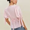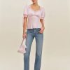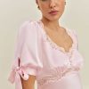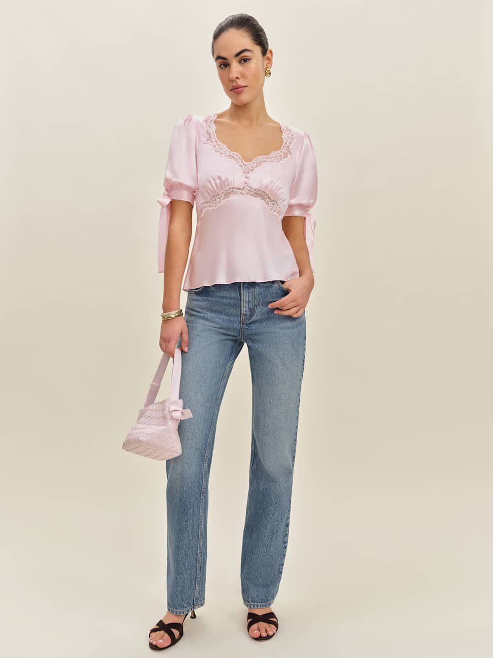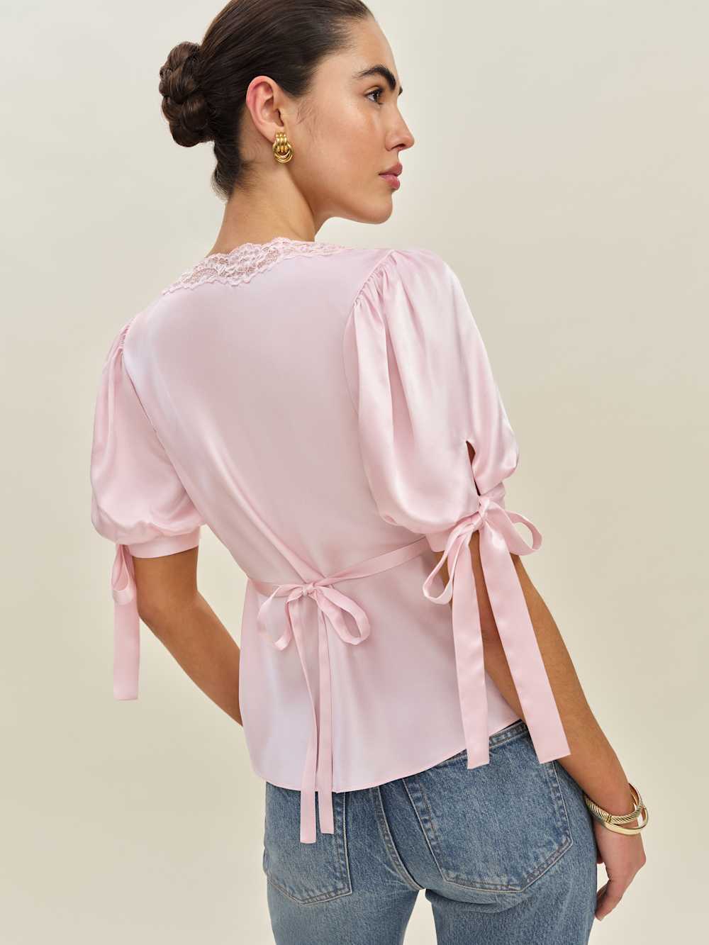 Up top. Shop the Dolly Silk Top from Reformation, a short puffed sleeve top with a v-neckline, ties at the arm, and lace detailing along the neck and bust.