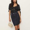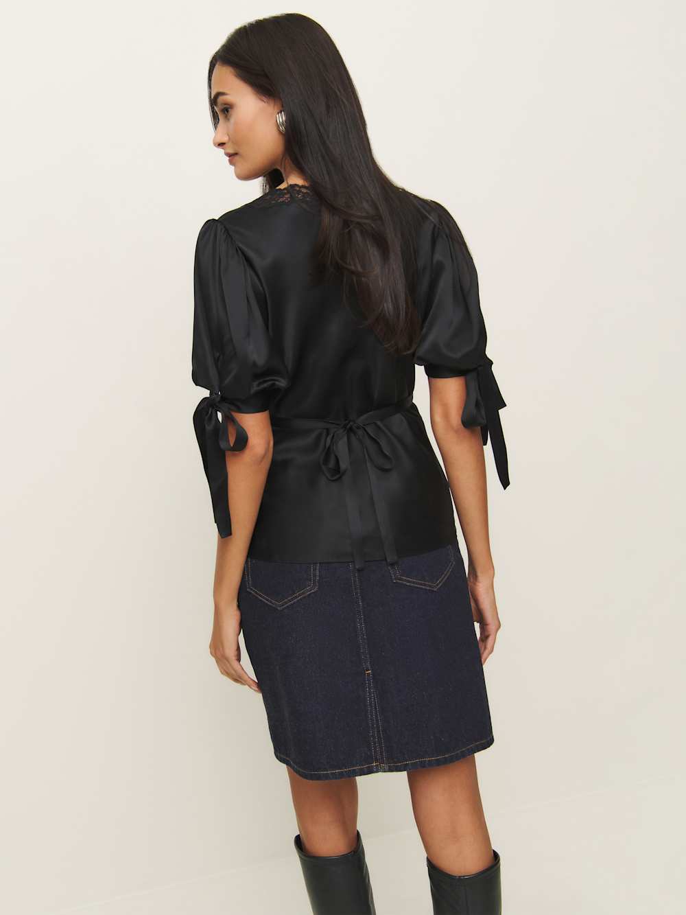 Up top. Shop the Dolly Silk Top from Reformation, a short puffed sleeve top with a v-neckline, ties at the arm, and lace detailing along the neck and bust.