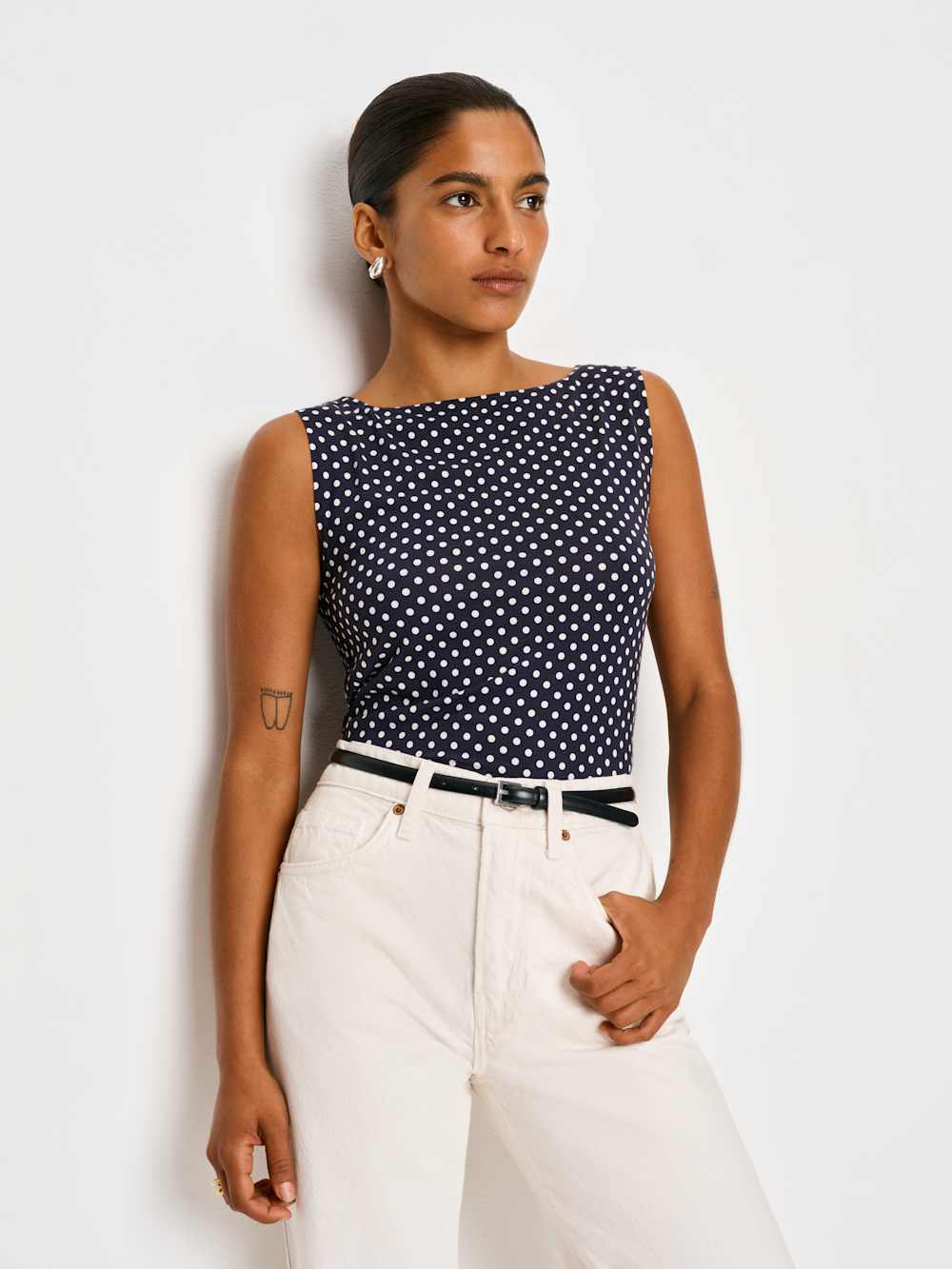 Bye sleeves. Shop the Dusk Knit Top from Reformation, a sleeveless, fitted top with a boat neckline.