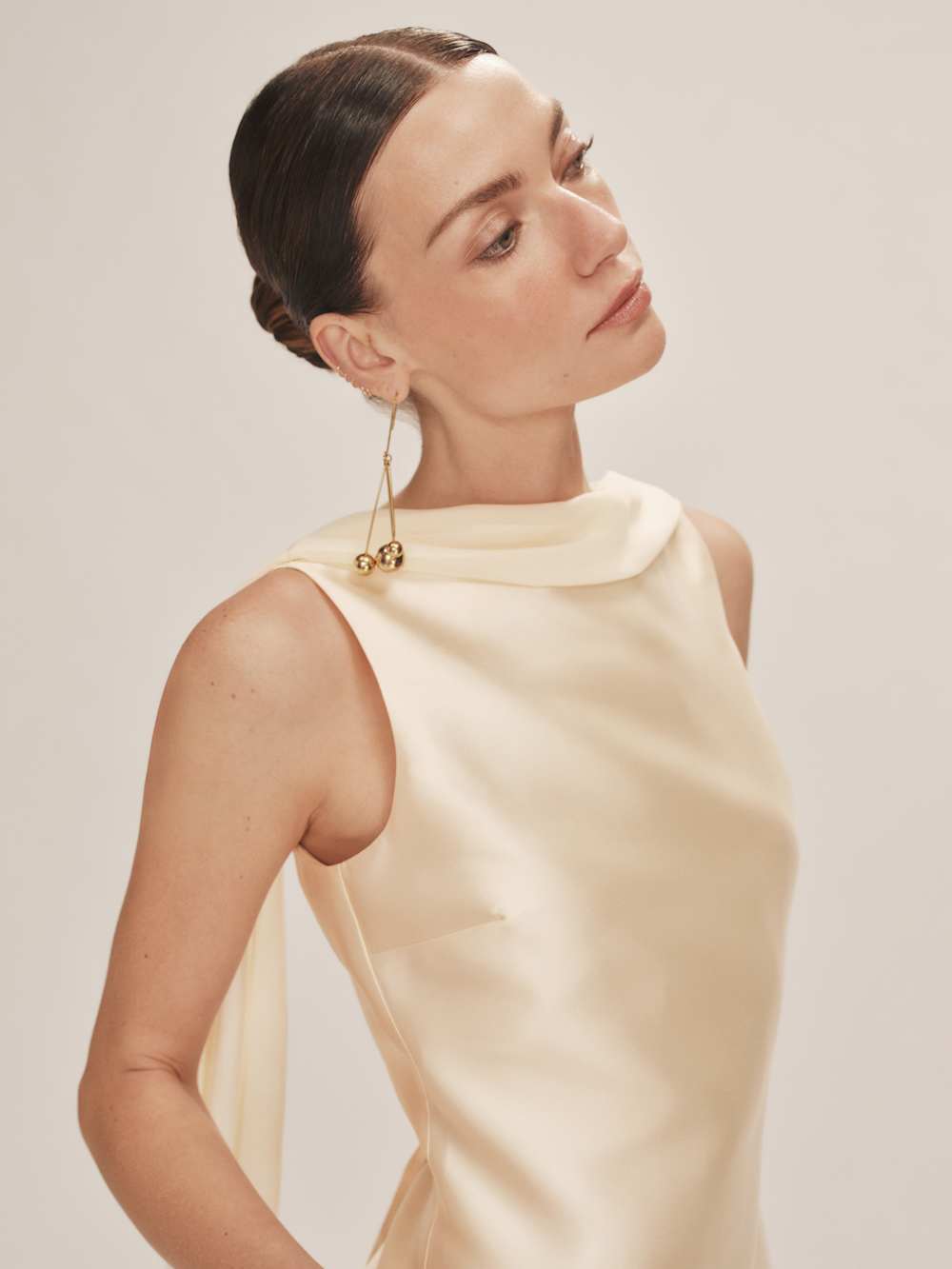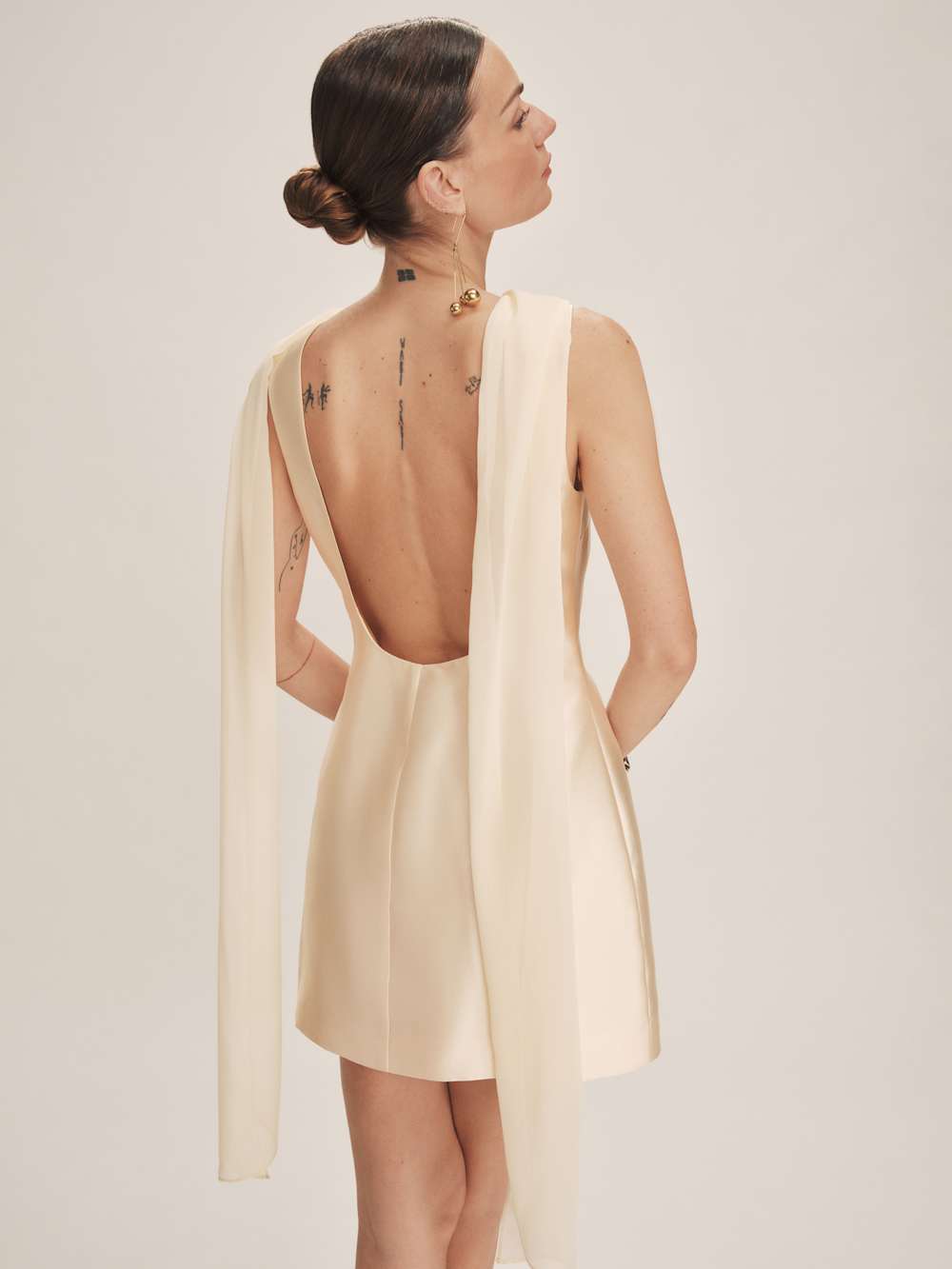 Wear the dress. Shop the Ecru Dress from Reformation, a sleeveless mini dress with a high boat neckline, open back, and attached scarf detailing.