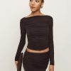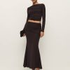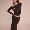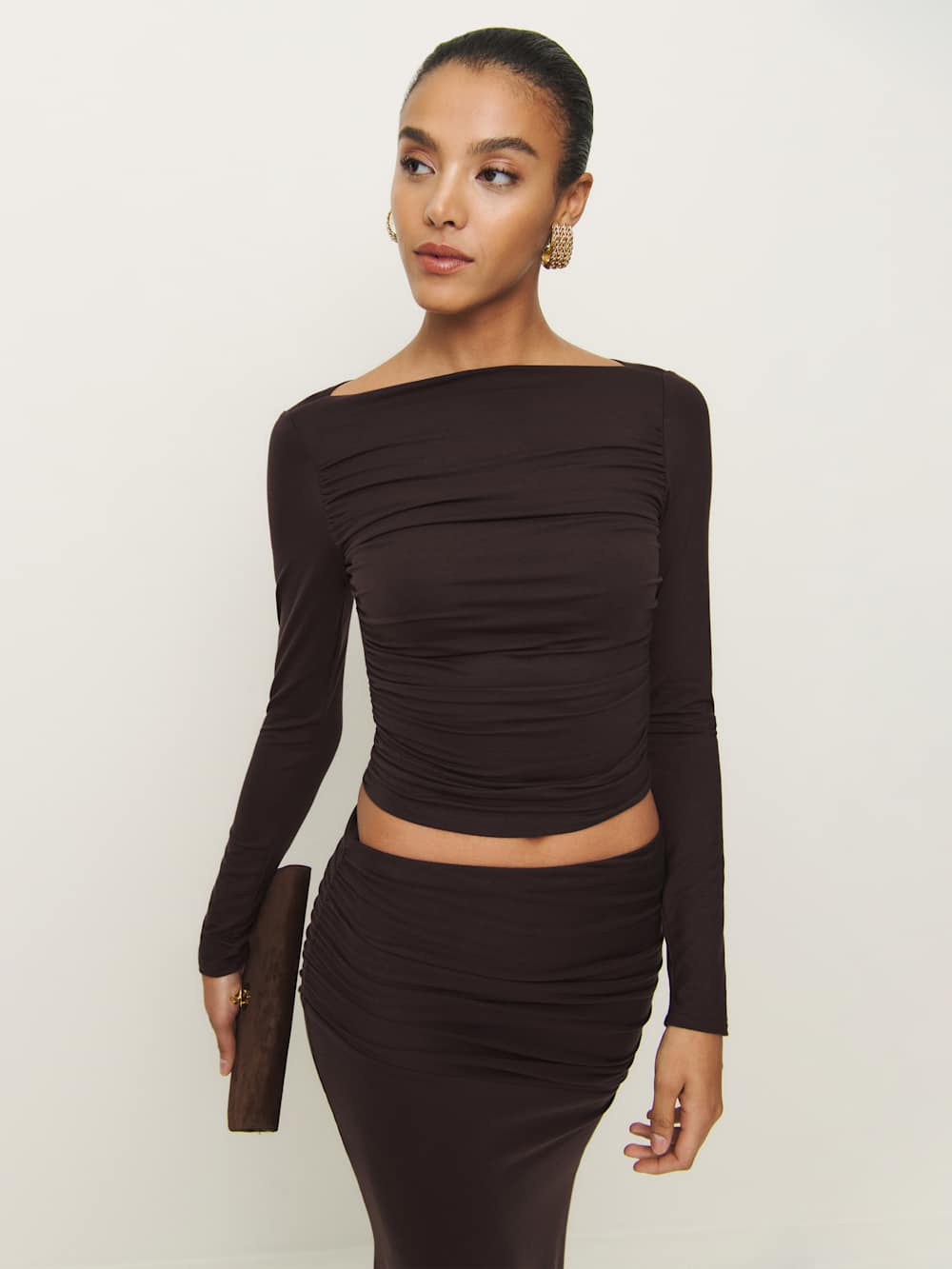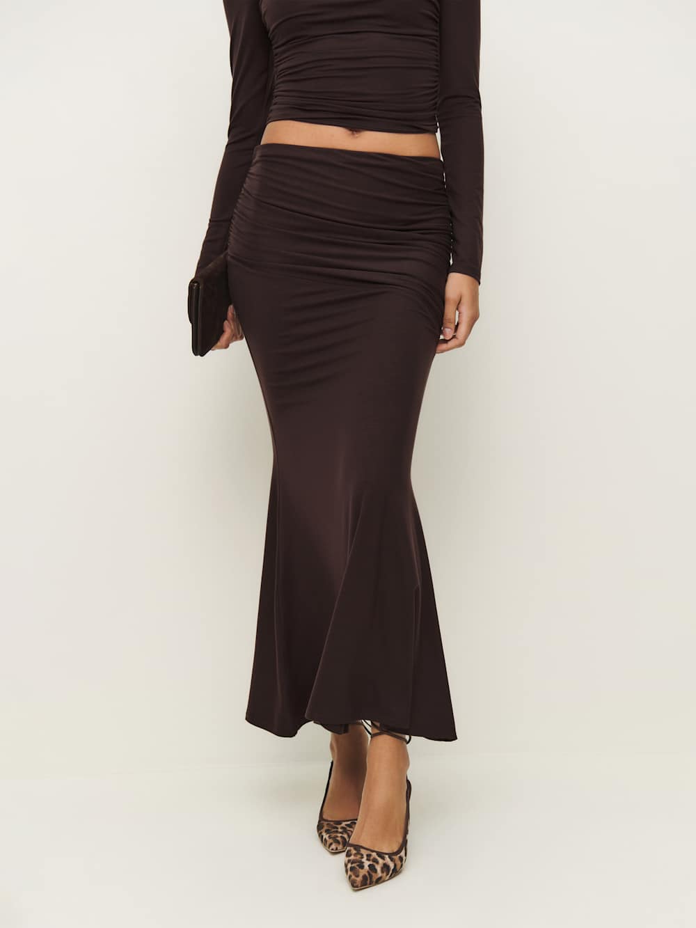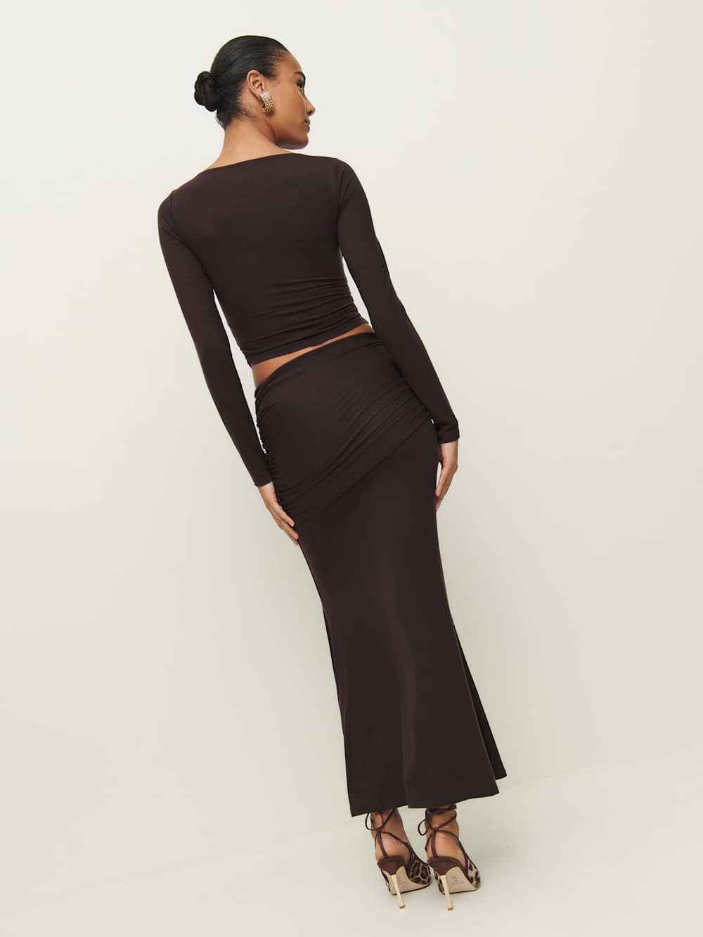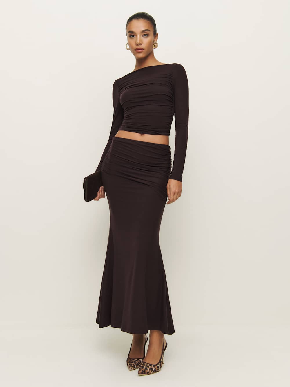 We go together. Shop the Emi Knit Two Piece from Reformation, a two piece set with a long-sleeved top and midi skirt. The set has ruching throughout.