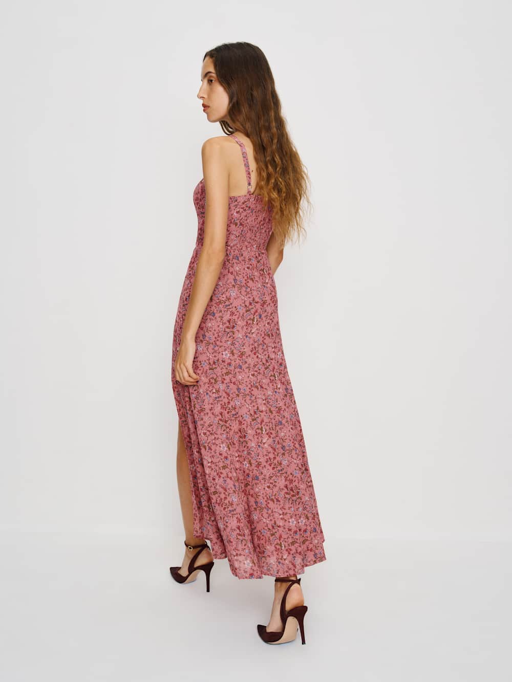 Big easy. Shop the Eridania Dress from Reformation, a sleeveless midi dress with a straight neckline, side slit, and pleating throughout the skirt.