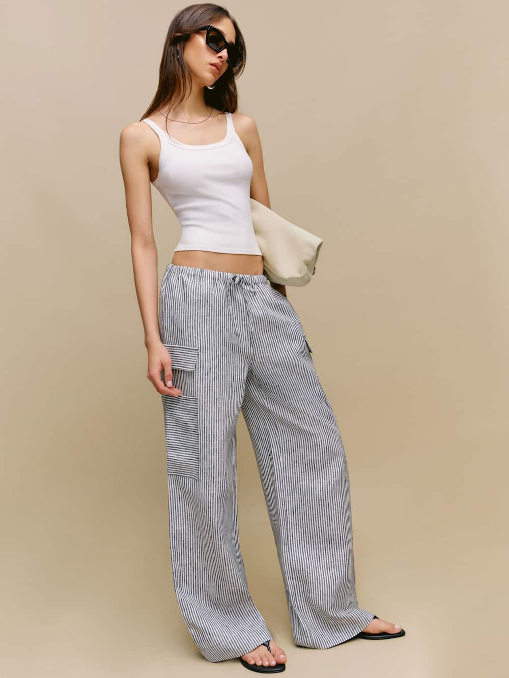 Shop the Ethan Linen Pant from Reformation, a high rise linen pant with an adjustable waist and side cargo pockets.