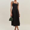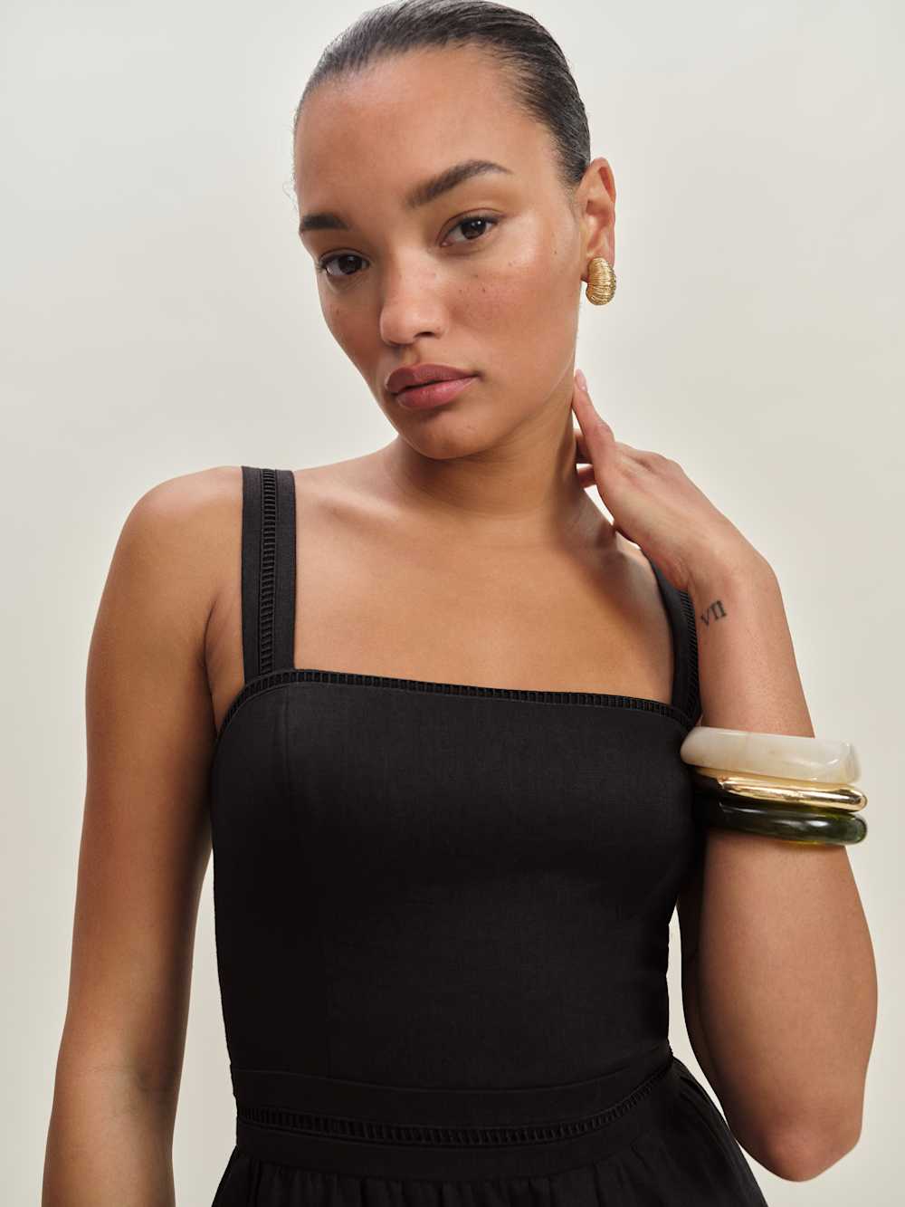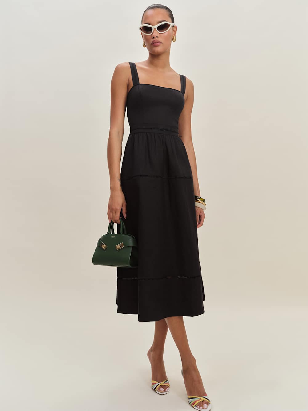 Wear me. Shop the Everett Linen Dress from Reformation, a sleeveless midi dress with a square neckline, fitted bust, relaxed skirt, and embroidery detailing.