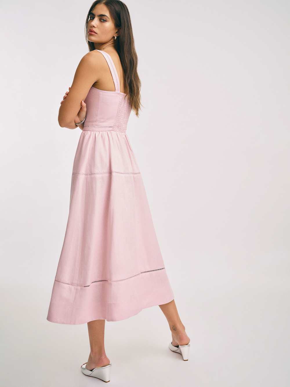 Wear me. Shop the Everett Linen Dress from Reformation, a sleeveless midi dress with a square neckline, fitted bust, relaxed skirt, and embroidery detailing.
