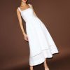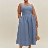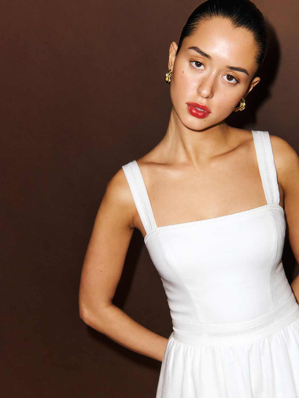 Wear me. Shop the Everett Linen Dress from Reformation, a sleeveless midi dress with a square neckline, fitted bust, relaxed skirt, and embroidery detailing.